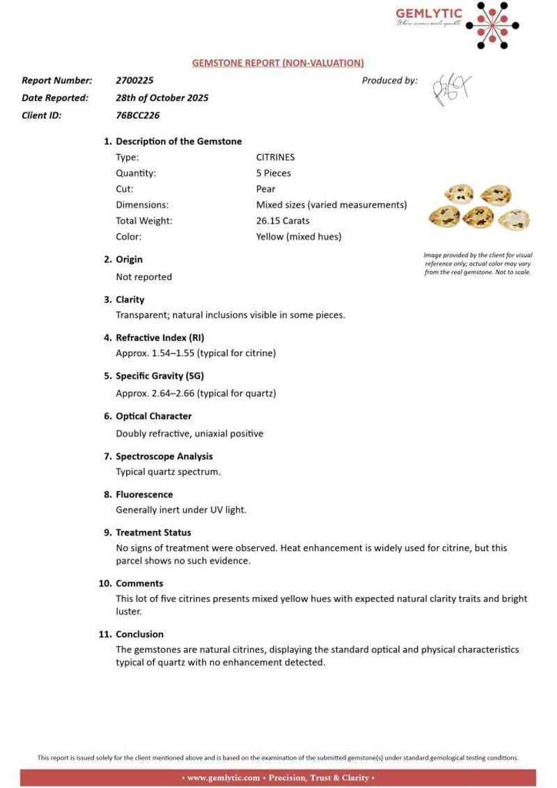 CITRINES - 26.15 CARATS - YELLOW (MIXED HUES) Quantity: 5 PcsReport Number: 2700225Clarity: Transparent; Natural Inclusions Visible In Some Pieces.Measurements: Mixed SizesTreatments: No Signs Of Treatment Were Observed. Heat Enhancement Is Widely Used For Citrine, But This Parcel Shows No Such Evidence.Origin: Not ReportedRefractive Index: Approx. 1.54–1.55 (Typical For Citrine)Specific Gravity: Approx. 2.64–2.66 (Typical For Quartz)Spectroscope Analysis: Typical Quartz Spectrum.Fluorescence: Generally Inert Under Uv Light.Comments: This Lot Of Five Citrines Presents Mixed Yellow Hues With Expected Natural Clarity Traits And Bright Luster.Conclusion: The Gemstones Are Natural Citrines, Displaying The Standard Optical And Physical Characteristics Typical Of Quartz With No Enhancement Detected. Condition: Good - Refer Images 0488396+41