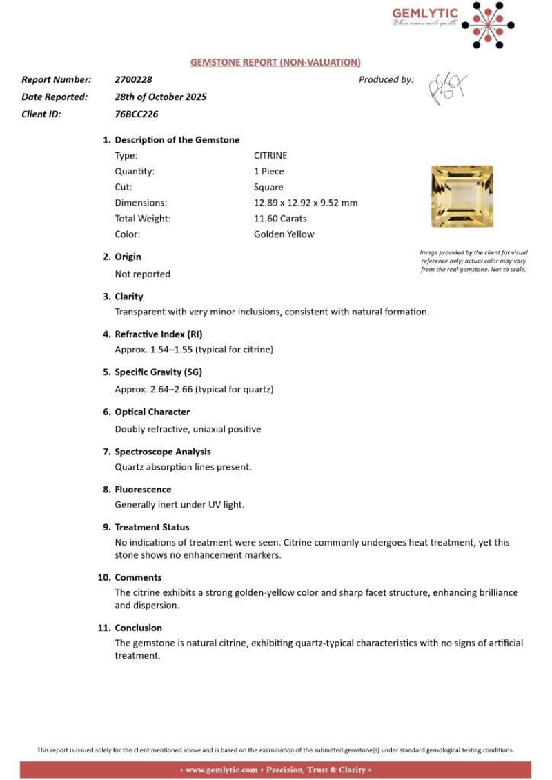 CITRINE - 11.60 CARATS - GOLDEN YELLOW Quantity: 1 PcsReport Number: 2700228Clarity: Transparent With Very Minor Inclusions, Consistent With Natural Formation.Measurements: 12.89 X 12.92 X 9.52Treatments: No Indications Of Treatment Were Seen. Citrine Commonly Undergoes Heat Treatment, Yet This Stone Shows No Enhancement Markers.Origin: Not ReportedRefractive Index: Approx. 1.54–1.55 (Typical For Citrine)Specific Gravity: Approx. 2.64–2.66 (Typical For Quartz)Spectroscope Analysis: Quartz Absorption Lines Present.Fluorescence: Generally Inert Under Uv Light.Comments: The Citrine Exhibits A Strong Golden-Yellow Color And Sharp Facet Structure, Enhancing Brilliance And Dispersion.Conclusion: The Gemstone Is Natural Citrine, Exhibiting Quartz-Typical Characteristics With No Signs Of Artificial Treatment. Condition: Good - Refer Images 0488396+44