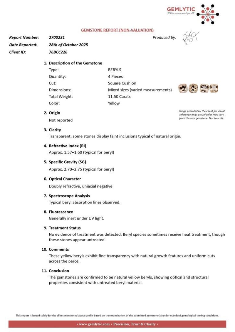 BERYLS - 11.50 CARATS - YELLOW Quantity: 4 PcsReport Number: 2700231Clarity: Transparent; Some Stones Display Faint Inclusions Typical Of Natural Origin.Measurements: Mixed SizesTreatments: No Evidence Of Treatment Was Detected. Beryl Species Sometimes Receive Heat Treatment, Though These Stones Appear Untreated.Origin: Not ReportedRefractive Index: Approx. 1.57–1.60 (Typical For Beryl)Specific Gravity: Approx. 2.70–2.75 (Typical For Beryl)Spectroscope Analysis: Typical Beryl Absorption Lines Observed.Fluorescence: Generally Inert Under Uv Light.Comments: These Yellow Beryls Exhibit Fine Transparency With Natural Growth Features And Uniform Cuts Across The Parcel.Conclusion: The Gemstones Are Confirmed To Be Natural Yellow Beryls, Showing Optical And Structural Properties Consistent With Untreated Beryl Material. Condition: Good - Refer Images 0488396+47
