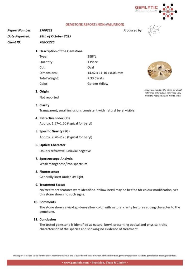 BERYL - 7.33 CARATS - GOLDEN YELLOW Quantity: 1 PcsReport Number: 2700232Clarity: Transparent; Small Inclusions Consistent With Natural Beryl Visible.Measurements: 14.42 X 11.16 X 8.03Treatments: No Treatment Features Were Identified. Yellow Beryl May Be Heated For Colour Modification, Yet This Stone Shows No Such Signs.Origin: Not ReportedRefractive Index: Approx. 1.57–1.60 (Typical For Beryl)Specific Gravity: Approx. 2.70–2.75 (Typical For Beryl)Spectroscope Analysis: Weak Manganese/Iron Spectrum.Fluorescence: Generally Inert Under Uv Light.Comments: The Stone Shows A Vivid Golden-Yellow Color With Natural Clarity Features Adding Character To The Gemstone.Conclusion: The Tested Gemstone Is Identified As Natural Beryl, Presenting Optical And Physical Traits Characteristic Of The Species And Showing No Evidence Of Treatment. Condition: Good - Refer Images 0488396+48