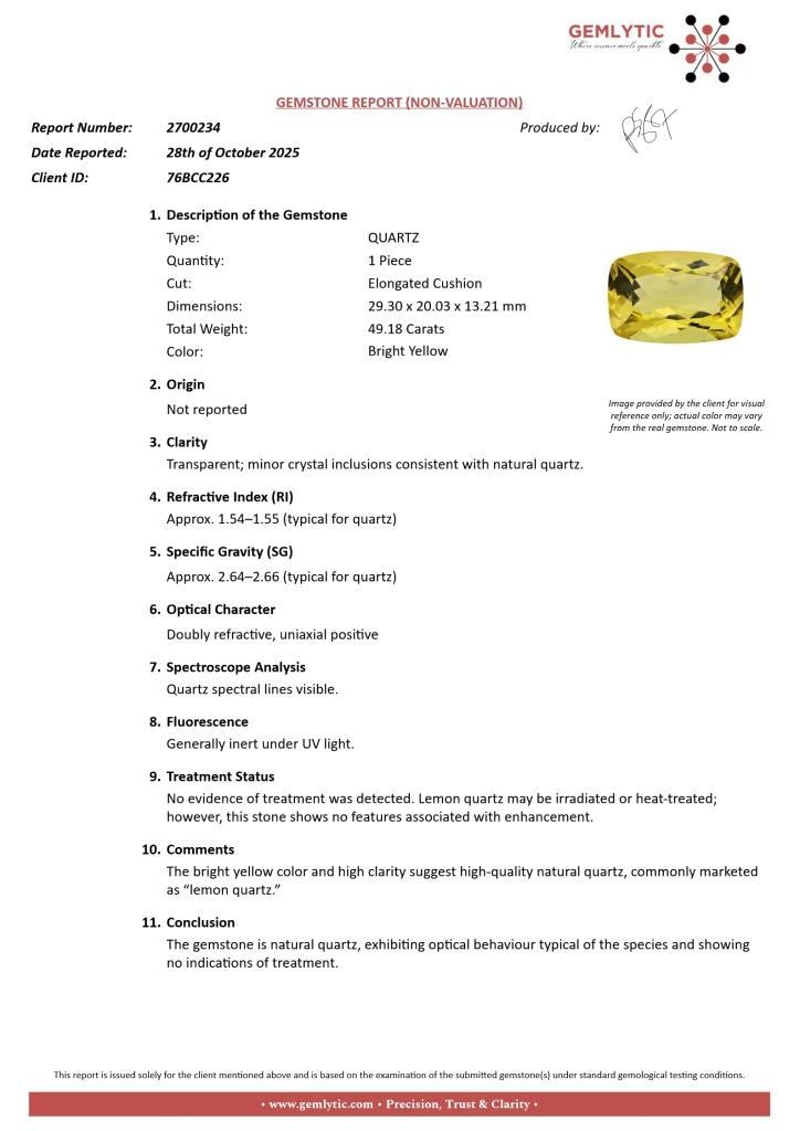 QUARTZ - 49.18 CARATS - BRIGHT YELLOW Quantity: 1 PcsReport Number: 2700234Clarity: Transparent; Minor Crystal Inclusions Consistent With Natural Quartz.Measurements: 29.30 X 20.03 X 13.21Treatments: No Evidence Of Treatment Was Detected. Lemon Quartz May Be Irradiated Or Heat-Treated; However, This Stone Shows No Features Associated With Enhancement.Origin: Not ReportedRefractive Index: Approx. 1.54–1.55 (Typical For Quartz)Specific Gravity: Approx. 2.64–2.66 (Typical For Quartz)Spectroscope Analysis: Quartz Spectral Lines Visible.Fluorescence: Generally Inert Under Uv Light.Comments: The Bright Yellow Color And High Clarity Suggest High-Quality Natural Quartz, Commonly Marketed As “Lemon Quartz.”Conclusion: The Gemstone Is Natural Quartz, Exhibiting Optical Behaviour Typical Of The Species And Showing No Indications Of Treatment. Condition: Good - Refer Images 0488396+50
