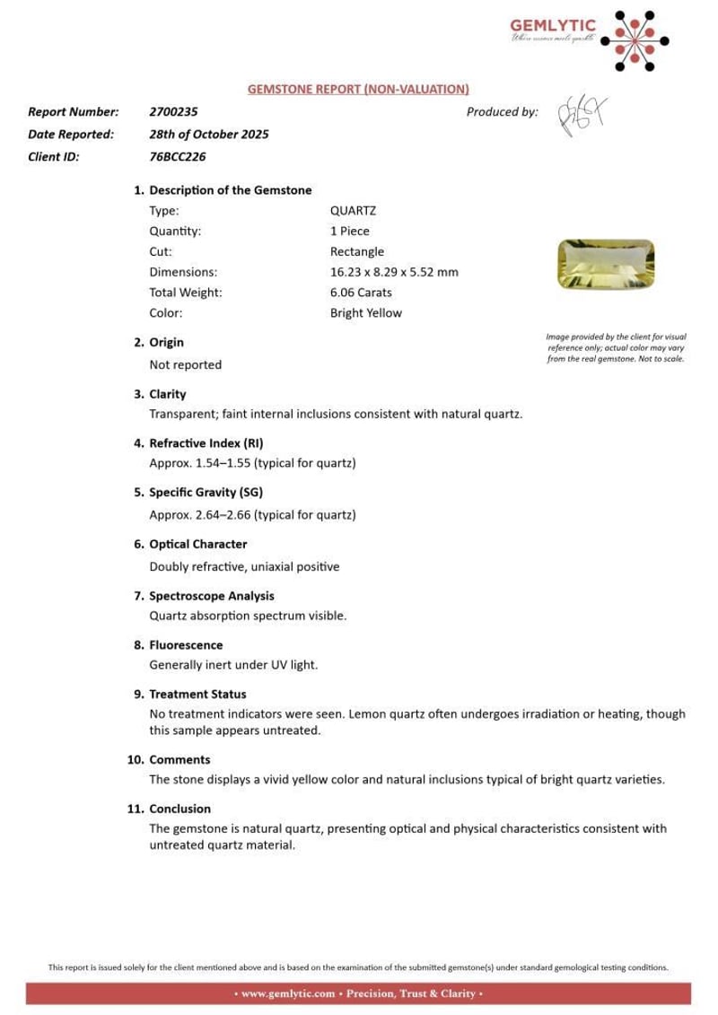 QUARTZ - 6.06 CARATS - BRIGHT YELLOW Quantity: 1 PcsReport Number: 2700235Clarity: Transparent; Faint Internal Inclusions Consistent With Natural Quartz.Measurements: 16.23 X 8.29 X 5.52Treatments: No Treatment Indicators Were Seen. Lemon Quartz Often Undergoes Irradiation Or Heating, Though This Sample Appears Untreated.Origin: Not ReportedRefractive Index: Approx. 1.54–1.55 (Typical For Quartz)Specific Gravity: Approx. 2.64–2.66 (Typical For Quartz)Spectroscope Analysis: Quartz Absorption Spectrum Visible.Fluorescence: Generally Inert Under Uv Light.Comments: The Stone Displays A Vivid Yellow Color And Natural Inclusions Typical Of Bright Quartz Varieties.Conclusion: The Gemstone Is Natural Quartz, Presenting Optical And Physical Characteristics Consistent With Untreated Quartz Material. Condition: Good - Refer Images 0488396+51