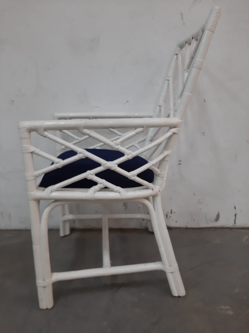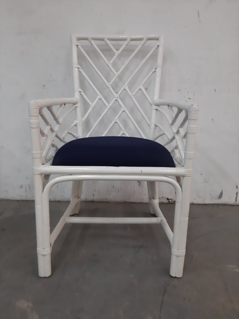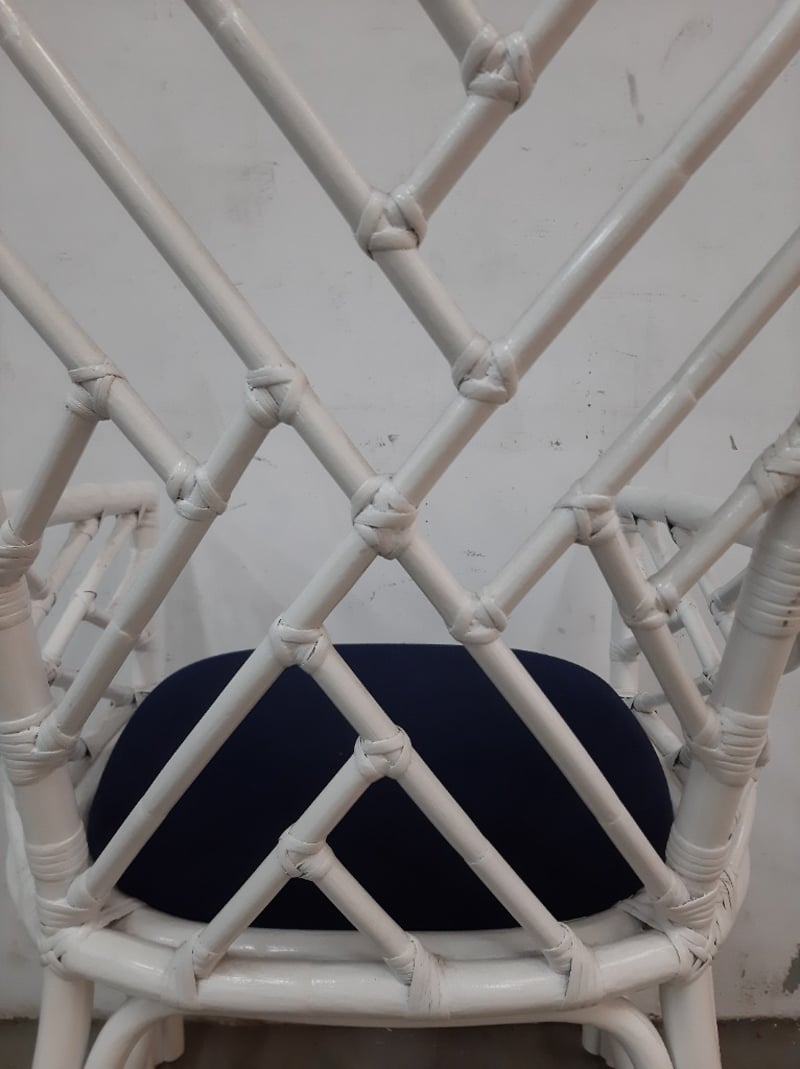 White Timber chair with navy cushionDimensions: 54cm x 98cm x 63cm