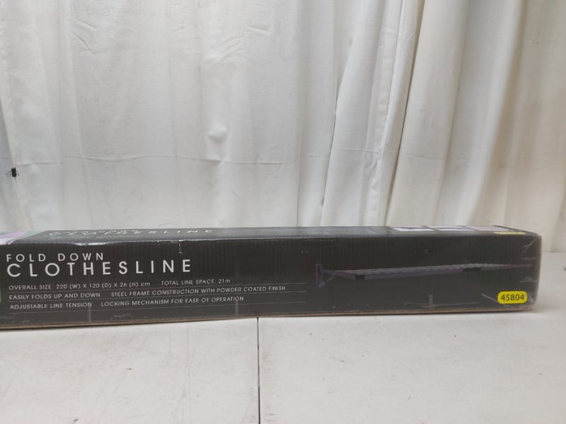 Fold down clothesline, steel frame powder coated black finishDimensions: 220cm x 120cm x 26cm