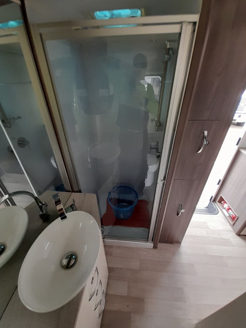 THE BATHROOM HAS LARGE SHOWER, SINK, TOILET AND MORE CUPBOARDS.