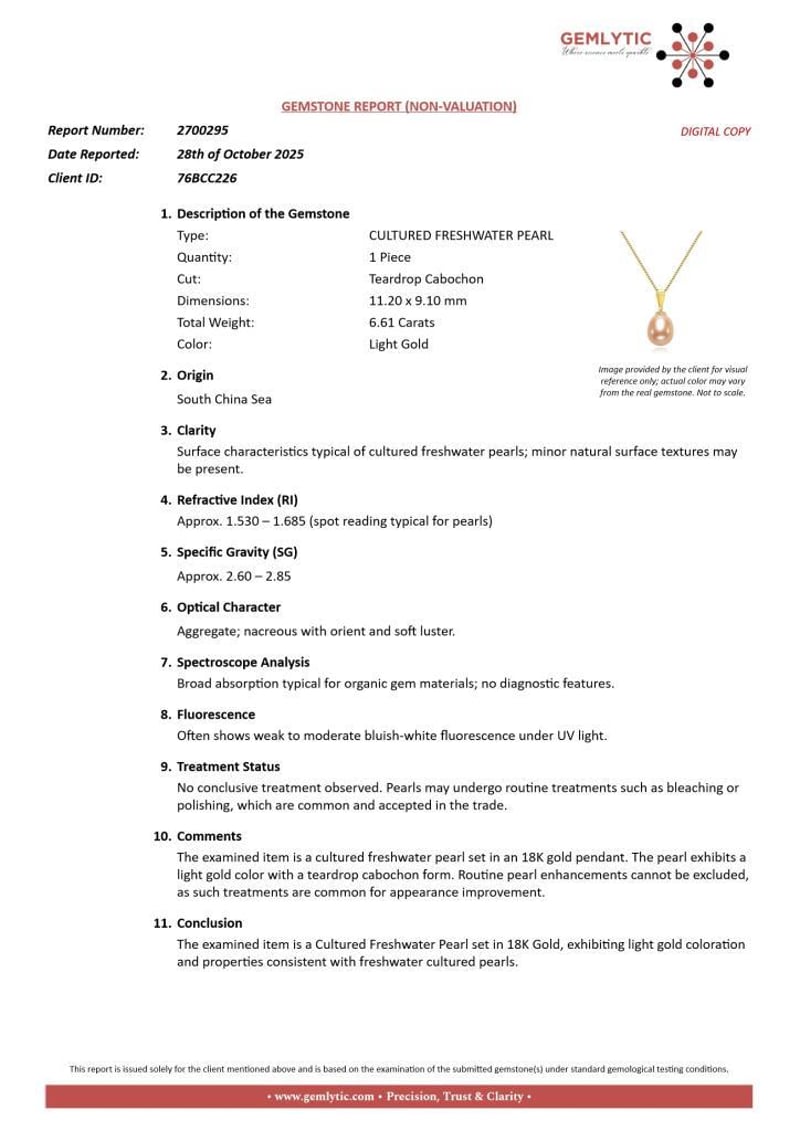 Comments: The Examined Item Is A Cultured Freshwater Pearl Set In An 18K Gold Pendant. The Pearl Exhibits A Light Gold Color With A Teardrop Cabochon Form. Routine Pearl Enhancements Cannot Be Excluded, As Such Treatments Are Common For Appearance Improvement.