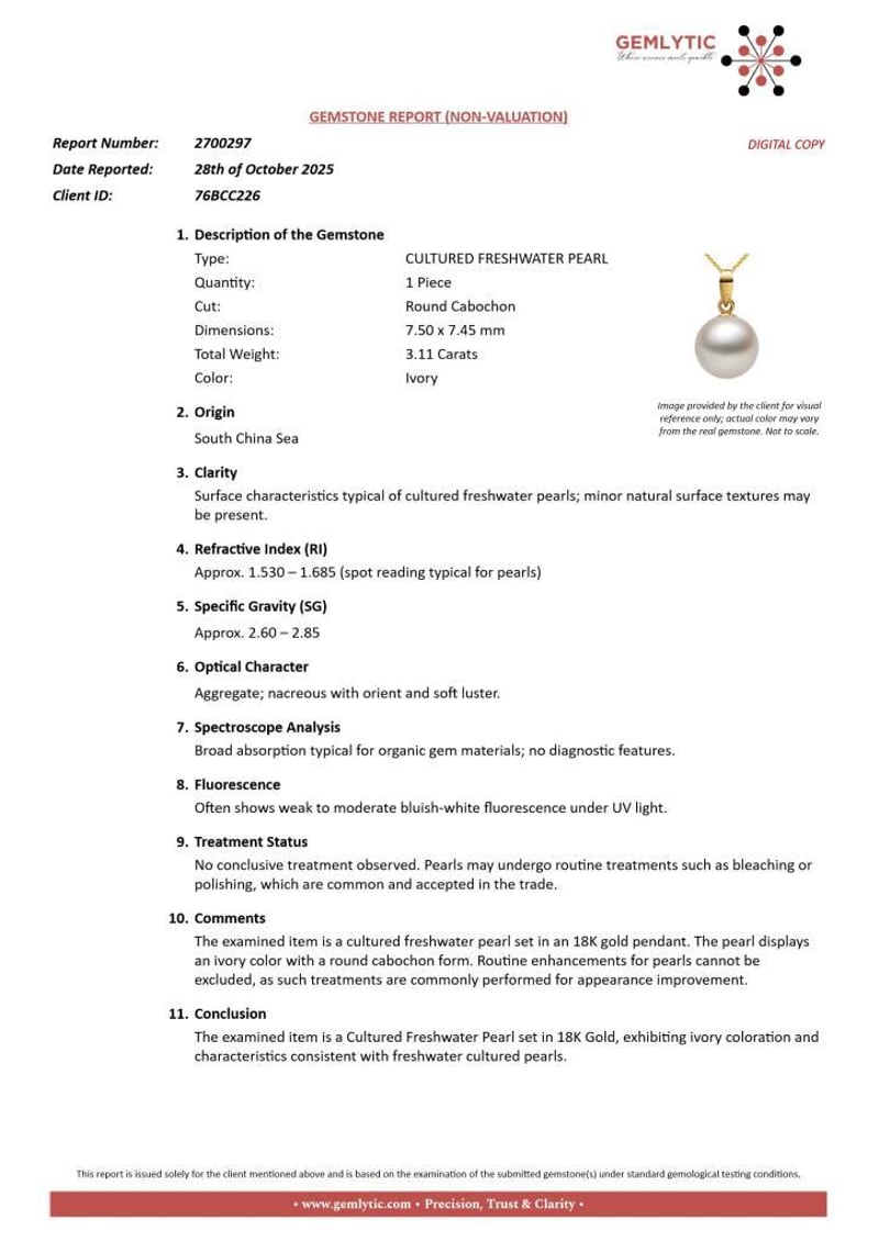 Comments: The Examined Item Is A Cultured Freshwater Pearl Set In An 18K Gold Pendant. The Pearl Displays An Ivory Color With A Round Cabochon Form. Routine Enhancements For Pearls Cannot Be Excluded, As Such Treatments Are Commonly Performed For Appearance Improvement.