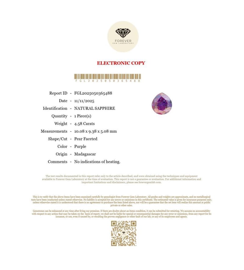 4.58 CARATS NATURAL PURPLE SAPPHIRE 4.58 Carats Natural SapphireCertificate Number - Fgl2025050365488Color - PurpleShape - Pear FacetedDimension - 10.08 X 9.38 X 5.08 MmOrigin - MadagascarComments - No Indications Of Heating.Good Quality With Luster Condition: Good - Refer Images 0488399+6