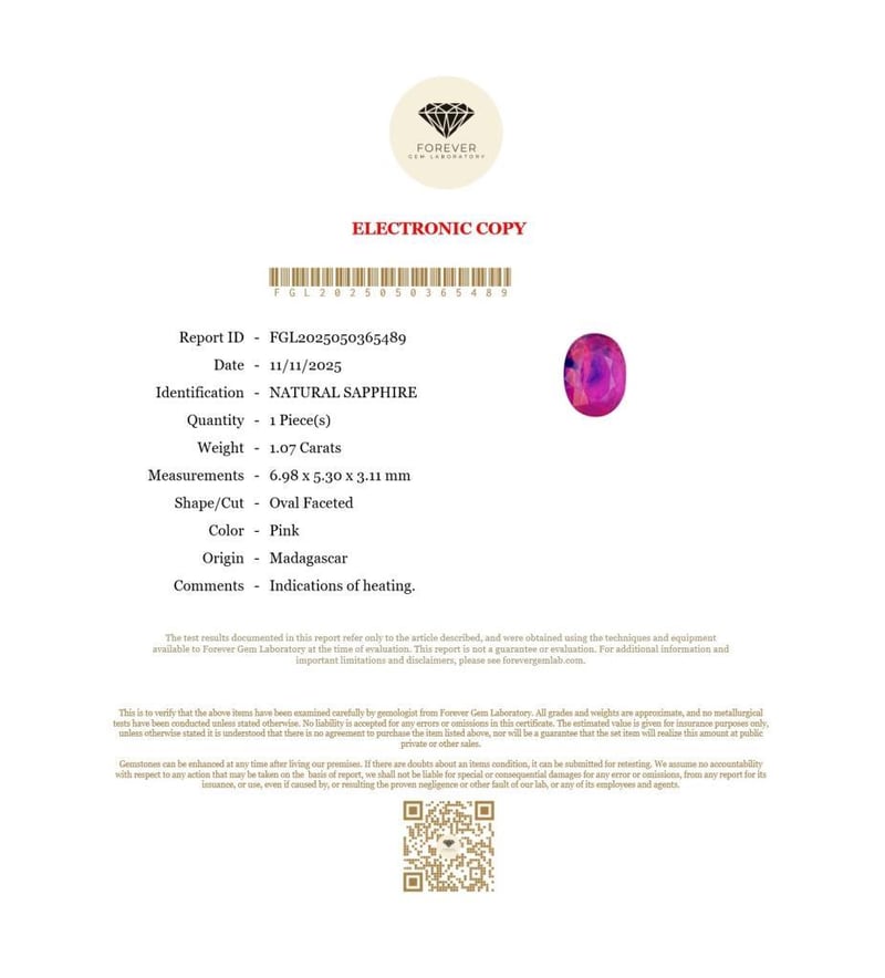 1.07 CARATS NATURAL PINK SAPPHIRE 1.07 Carats Natural SapphireCertificate Number - Fgl2025050365489Color - PinkShape - Oval FacetedDimension - 6.98 X 5.30 X 3.11 MmOrigin - MadagascarComments - Indications Of Heating.Good Quality With Luster Condition: Good - Refer Images 0488399+7