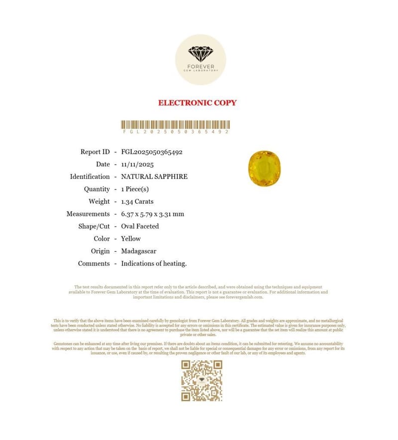 1.34 CARATS NATURAL YELLOW SAPPHIRE 1.34 Carats Natural SapphireCertificate Number - Fgl2025050365492Color - YellowShape - Oval FacetedDimension - 6.37 X 5.79 X 3.31 MmOrigin - MadagascarComments - Indications Of Heating.Good Quality With Luster Condition: Good - Refer Images 0488399+10
