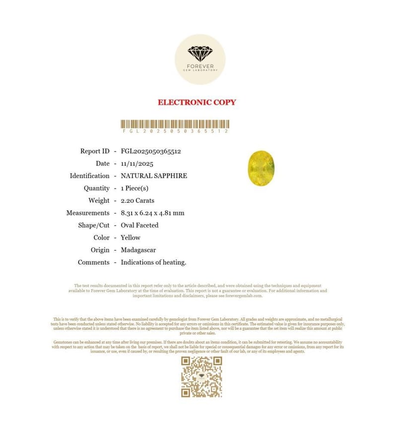 2.20 CARATS NATURAL YELLOW SAPPHIRE 2.20 Carats Natural SapphireCertificate Number - Fgl2025050365512Color - YellowShape - Oval FacetedDimension - 8.31 X 6.24 X 4.81 MmOrigin - MadagascarComments - Indications Of Heating.Good Quality With Luster Condition: Good - Refer Images 0488399+30