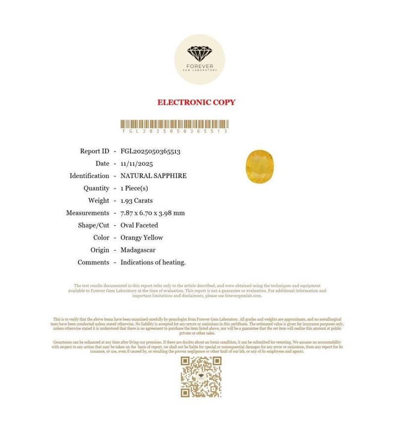 1.93 CARATS NATURAL ORANGY YELLOW SAPPHIRE 1.93 Carats Natural SapphireCertificate Number - Fgl2025050365513Color - Orangy YellowShape - Oval FacetedDimension - 7.87 X 6.70 X 3.98 MmOrigin - MadagascarComments - Indications Of Heating.Good Quality With Luster Condition: Good - Refer Images 0488399+31
