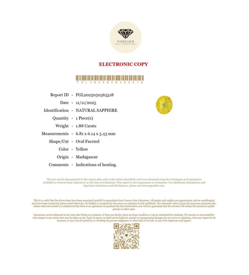 1.88 CARATS NATURAL YELLOW SAPPHIRE 1.88 Carats Natural SapphireCertificate Number - Fgl2025050365518Color - YellowShape - Oval FacetedDimension - 6.81 X 6.14 X 5.43 MmOrigin - MadagascarComments - Indications Of Heating.Good Quality With Luster Condition: Good - Refer Images 0488399+36