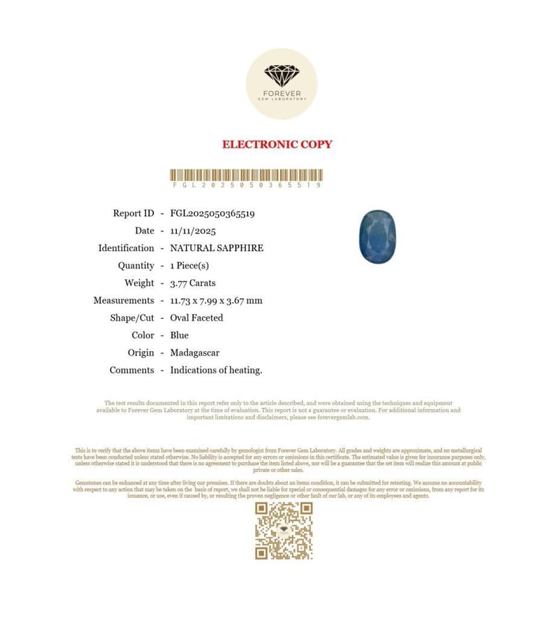 3.77 CARATS NATURAL BLUE SAPPHIRE 3.77 Carats Natural SapphireCertificate Number - Fgl2025050365519Color - BlueShape - Oval FacetedDimension - 11.73 X 7.99 X 3.67 MmOrigin - MadagascarComments - Indications Of Heating.Good Quality With Luster Condition: Good - Refer Images 0488399+37
