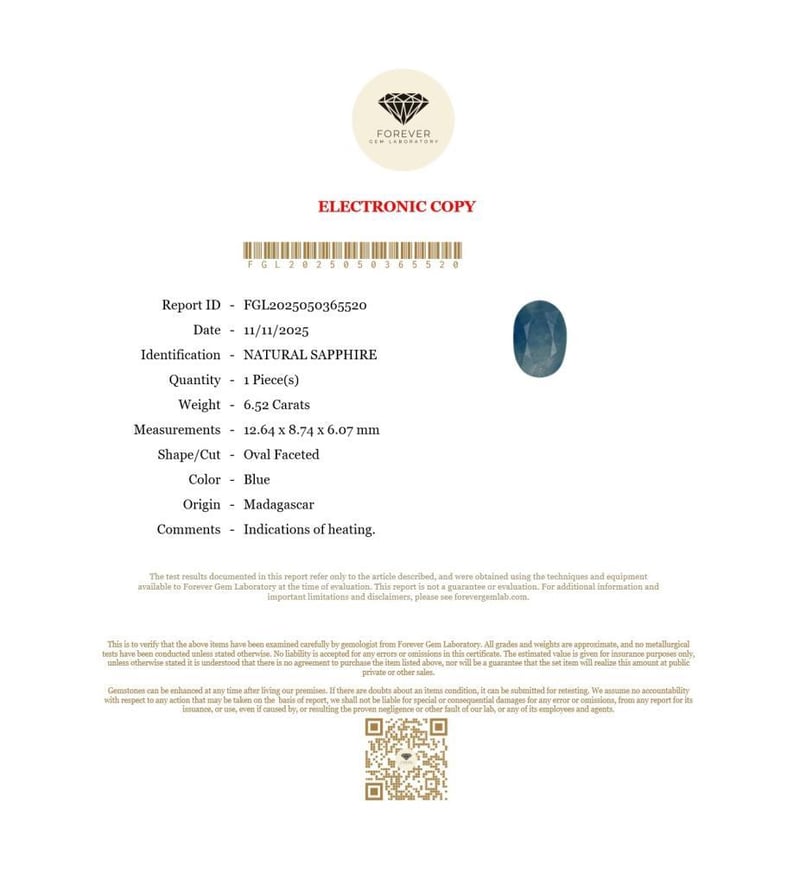 6.52 CARATS NATURAL BLUE SAPPHIRE 6.52 Carats Natural SapphireCertificate Number - Fgl2025050365520Color - BlueShape - Oval FacetedDimension - 12.64 X 8.74 X 6.07 MmOrigin - MadagascarComments - Indications Of Heating.Good Quality With Luster Condition: Good - Refer Images 0488399+38