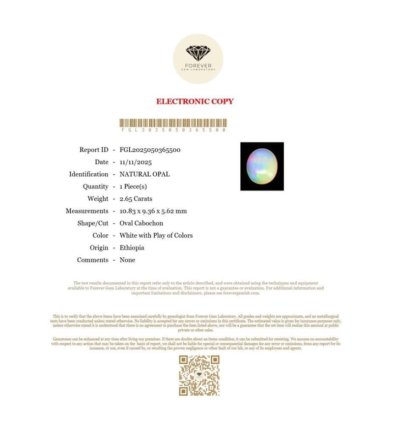 2.65 CARATS NATURAL OPAL WHITE PLAY OF COLORS 2.65 Carats Natural OpalCertificate Number - Fgl2025050365500Color - White With Play Of ColorsShape - Oval CabochonDimension - 10.83 X 9.36 X 5.62 MmOrigin - EthiopiaComments - NoneGood Quality With Luster Condition: Good - Refer Images 0488399+18
