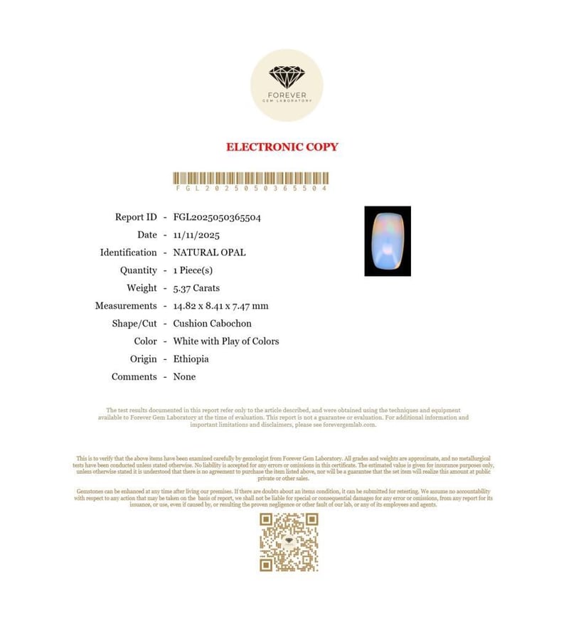 5.37 CARATS NATURAL OPAL WHITE PLAY OF COLORS 5.37 Carats Natural OpalCertificate Number - Fgl2025050365504Color - White With Play Of ColorsShape - Cushion CabochonDimension - 14.82 X 8.41 X 7.47 MmOrigin - EthiopiaComments - NoneGood Quality With Luster Condition: Good - Refer Images 0488399+22