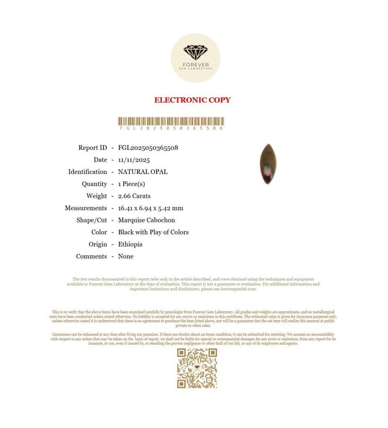 2.66 CARATS NATURAL OPAL BLACK PLAY OF COLORS 2.66 Carats Natural OpalCertificate Number - Fgl2025050365508Color - Black With Play Of ColorsShape - Marquise CabochonDimension - 16.41 X 6.94 X 5.42 MmOrigin - EthiopiaComments - NoneGood Quality With Luster Condition: Good - Refer Images 0488399+26