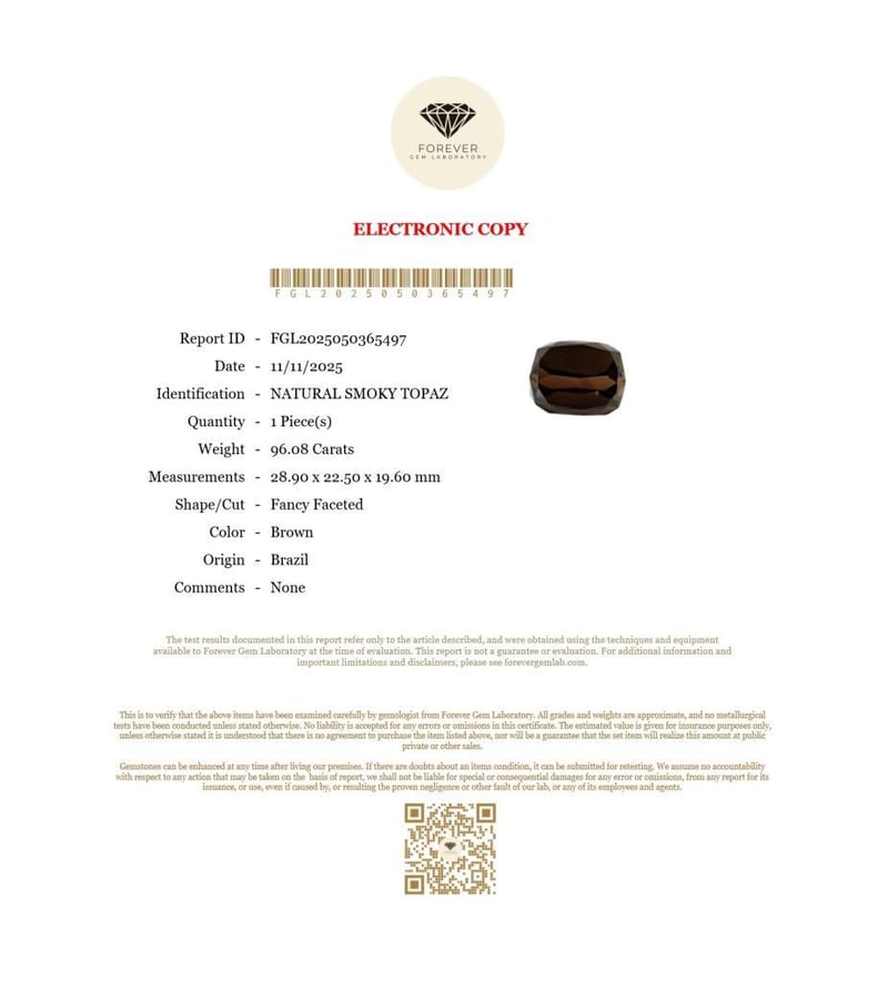 96.08 CARATS NATURAL SMOKY TOPAZ 96.08 Carats Natural Smoky TopazCertificate Number - Fgl2025050365497Color - BrownShape - Fancy FacetedDimension - 28.90 X 22.50 X 19.60 MmOrigin - BrazilComments - NoneGood Quality With Luster Condition: Good - Refer Images 0488399+15