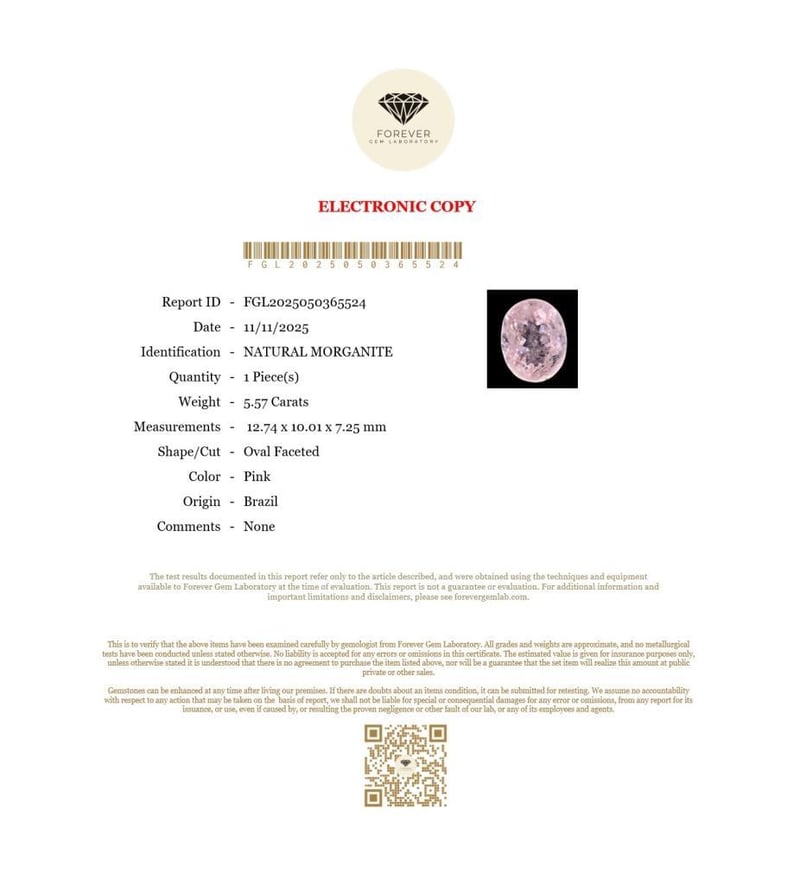 5.57 CARATS NATURAL PINK MORGANITE 5.57 Carats Natural MorganiteCertificate Number - Fgl2025050365524Color - PinkShape - Oval FacetedDimension - 12.74 X 10.01 X 7.25 MmOrigin - BrazilComments - NoneGood Quality With Luster Condition: Good - Refer Images 0488399+42