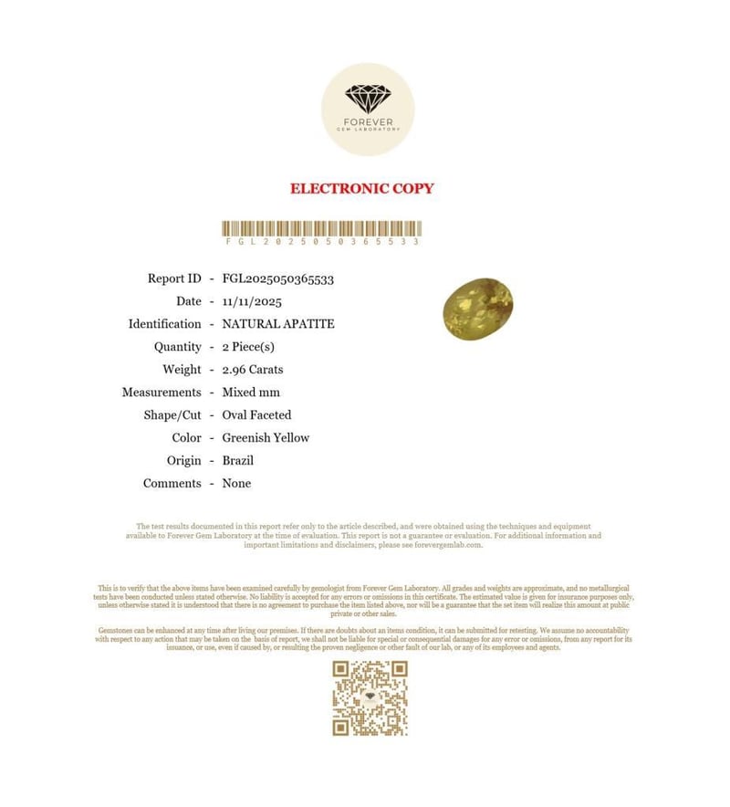 2.96 CARATS NATURAL YELLOW APATITE 2.96 Carats Natural ApatiteCertificate Number - Fgl2025050365533Color - Greenish YellowShape - Oval FacetedDimension - Mixed MmOrigin - BrazilComments - NoneGood Quality With Luster Condition: Good - Refer Images 0488399+51