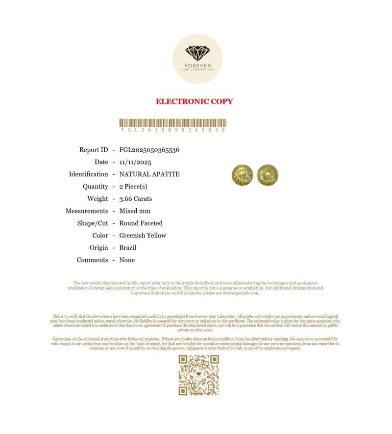 3.66 CARATS NATURAL YELLOW APATITE 3.66 Carats Natural ApatiteCertificate Number - Fgl2025050365536Color - Greenish YellowShape - Round FacetedDimension - Mixed MmOrigin - BrazilComments - NoneGood Quality With Luster Condition: Good - Refer Images 0488399+54