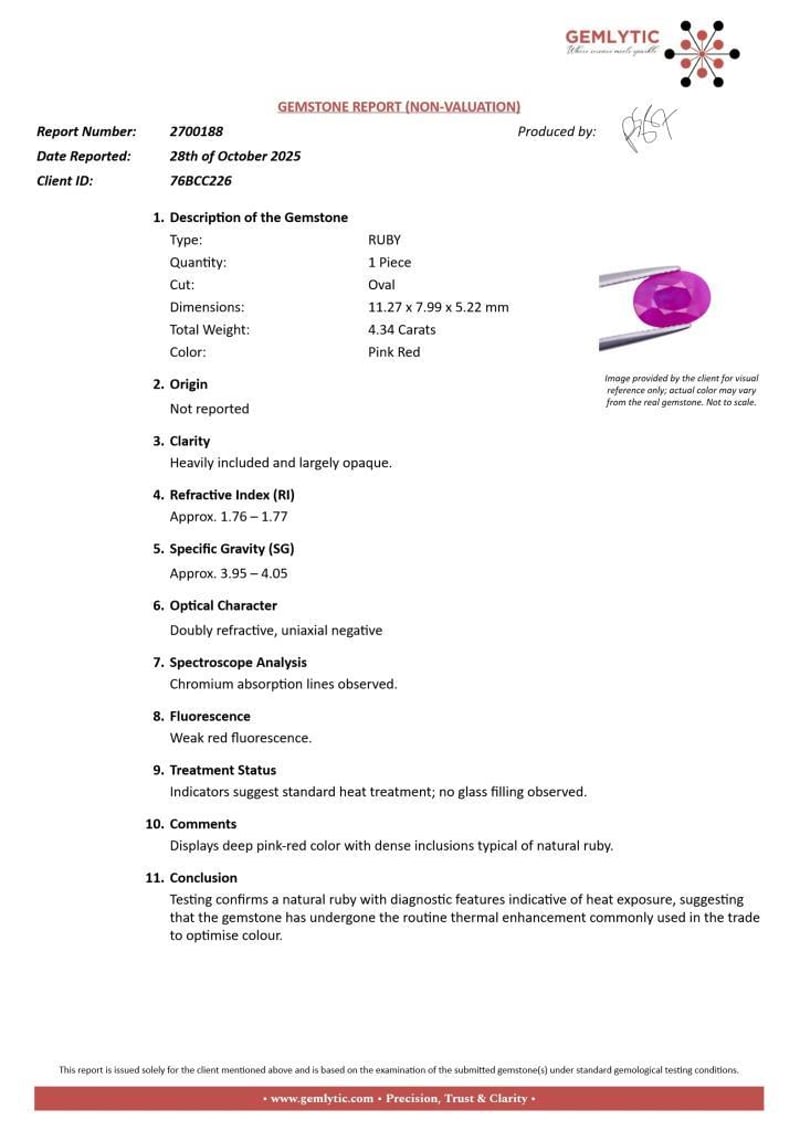 RUBY - 4.34 CARATS - PINK RED Quantity: 1 PcsReport Number: 2700188Clarity: Heavily Included And Largely Opaque.Measurements: 11.27 X 7.99 X 5.22Treatments: Indicators Suggest Standard Heat Treatment; No Glass Filling Observed.Origin: Not ReportedRefractive Index: Approx. 1.76 – 1.77Specific Gravity: Approx. 3.95 – 4.05Spectroscope Analysis: Chromium Absorption Lines Observed.Fluorescence: Weak Red Fluorescence.Comments: Displays Deep Pink‑Red Color With Dense Inclusions Typical Of Natural Ruby.Conclusion: Testing Confirms A Natural Ruby With Diagnostic Features Indicative Of Heat Exposure, Suggesting That The Gemstone Has Undergone The Routine Thermal Enhancement Commonly Used In The Trade To Optimise Colour. Condition: Good - Refer Images 0488396+4