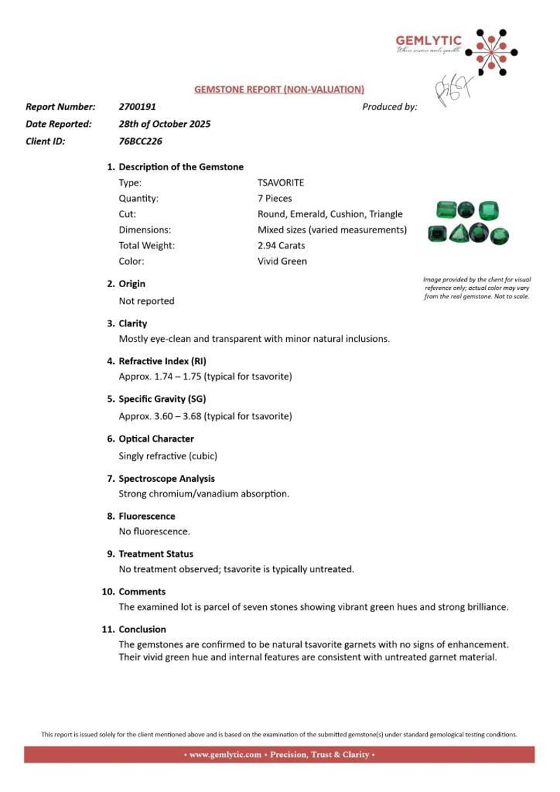 TSAVORITE - 2.94 CARATS - VIVID GREEN Quantity: 7 PcsReport Number: 2700191Clarity: Mostly Eye‑Clean And Transparent With Minor Natural Inclusions.Measurements: Mixed SizesTreatments: No Treatment Observed; Tsavorite Is Typically Untreated.Origin: Not ReportedRefractive Index: Approx. 1.74 – 1.75 (Typical For Tsavorite)Specific Gravity: Approx. 3.60 – 3.68 (Typical For Tsavorite)Spectroscope Analysis: Strong Chromium/Vanadium Absorption.Fluorescence: No Fluorescence.Comments: The Examined Lot Is Parcel Of Seven Stones Showing Vibrant Green Hues And Strong Brilliance.Conclusion: The Gemstones Are Confirmed To Be Natural Tsavorite Garnets With No Signs Of Enhancement. Their Vivid Green Hue And Internal Features Are Consistent With Untreated Garnet Material. Condition: Good - Refer Images 0488396+7