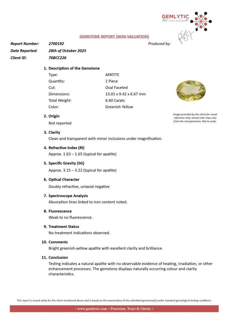 APATITE - 6.60 CARATS - GREENISH YELLOW Quantity: 1 PcsReport Number: 2700192Clarity: Clean And Transparent With Minor Inclusions Under Magnification.Measurements: 13.01 X 9.42 X 6.67Treatments: No Treatment Indications Observed.Origin: Not ReportedRefractive Index: Approx. 1.63 – 1.65 (Typical For Apatite)Specific Gravity: Approx. 3.15 – 3.22 (Typical For Apatite)Spectroscope Analysis: Absorption Lines Linked To Iron Content Noted.Fluorescence: Weak To No Fluorescence.Comments: Bright Greenish‑Yellow Apatite With Excellent Clarity And Brilliance.Conclusion: Testing Indicates A Natural Apatite With No Observable Evidence Of Heating, Irradiation, Or Other Enhancement Processes. The Gemstone Displays Naturally Occurring Colour And Clarity Characteristics. Condition: Good - Refer Images 0488396+8