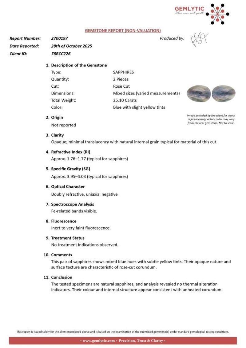 SAPPHIRES - 25.10 CARATS - BLUE WITH SLIGHT YELLOW TINTS Quantity: 2 PcsReport Number: 2700197Clarity: Opaque; Minimal Translucency With Natural Internal Grain Typical For Material Of This Cut.Measurements: Mixed SizesTreatments: No Treatment Indications Observed.Origin: Not ReportedRefractive Index: Approx. 1.76–1.77 (Typical For Sapphires)Specific Gravity: Approx. 3.95–4.03 (Typical For Sapphires)Spectroscope Analysis: Fe-Related Bands Visible.Fluorescence: Inert To Very Faint Fluorescence.Comments: This Pair Of Sapphires Shows Mixed Blue Hues With Subtle Yellow Tints. Their Opaque Nature And Surface Texture Are Characteristic Of Rose-Cut Corundum.Conclusion: The Tested Specimens Are Natural Sapphires, And Analysis Revealed No Thermal Alteration Indicators. Their Colour And Internal Structure Appear Consistent With Unheated Corundum. Condition: Good - Refer Images 0488396+13