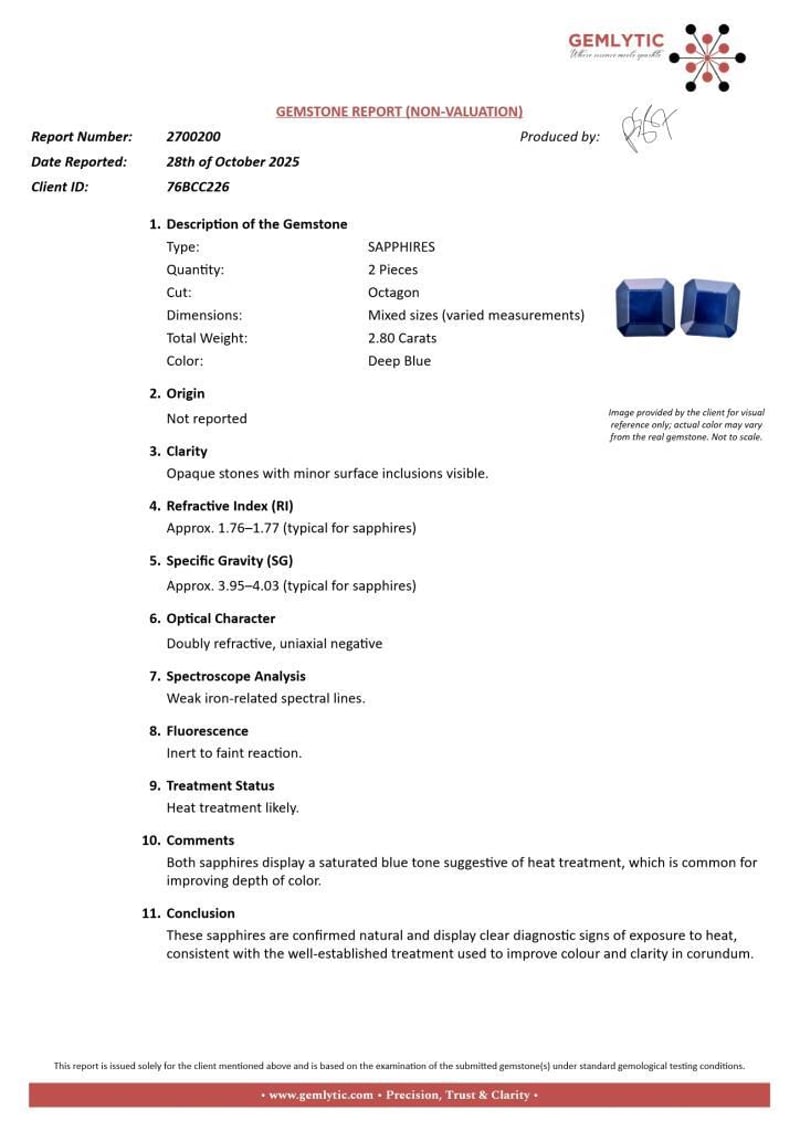 SAPPHIRES - 2.80 CARATS - DEEP BLUE Quantity: 2 PcsReport Number: 2700200Clarity: Opaque Stones With Minor Surface Inclusions Visible.Measurements: Mixed SizesTreatments: Heat Treatment Likely.Origin: Not ReportedRefractive Index: Approx. 1.76–1.77 (Typical For Sapphires)Specific Gravity: Approx. 3.95–4.03 (Typical For Sapphires)Spectroscope Analysis: Weak Iron-Related Spectral Lines.Fluorescence: Inert To Faint Reaction.Comments: Both Sapphires Display A Saturated Blue Tone Suggestive Of Heat Treatment, Which Is Common For Improving Depth Of Color.Conclusion: These Sapphires Are Confirmed Natural And Display Clear Diagnostic Signs Of Exposure To Heat, Consistent With The Well-Established Treatment Used To Improve Colour And Clarity In Corundum. Condition: Good - Refer Images 0488396+16