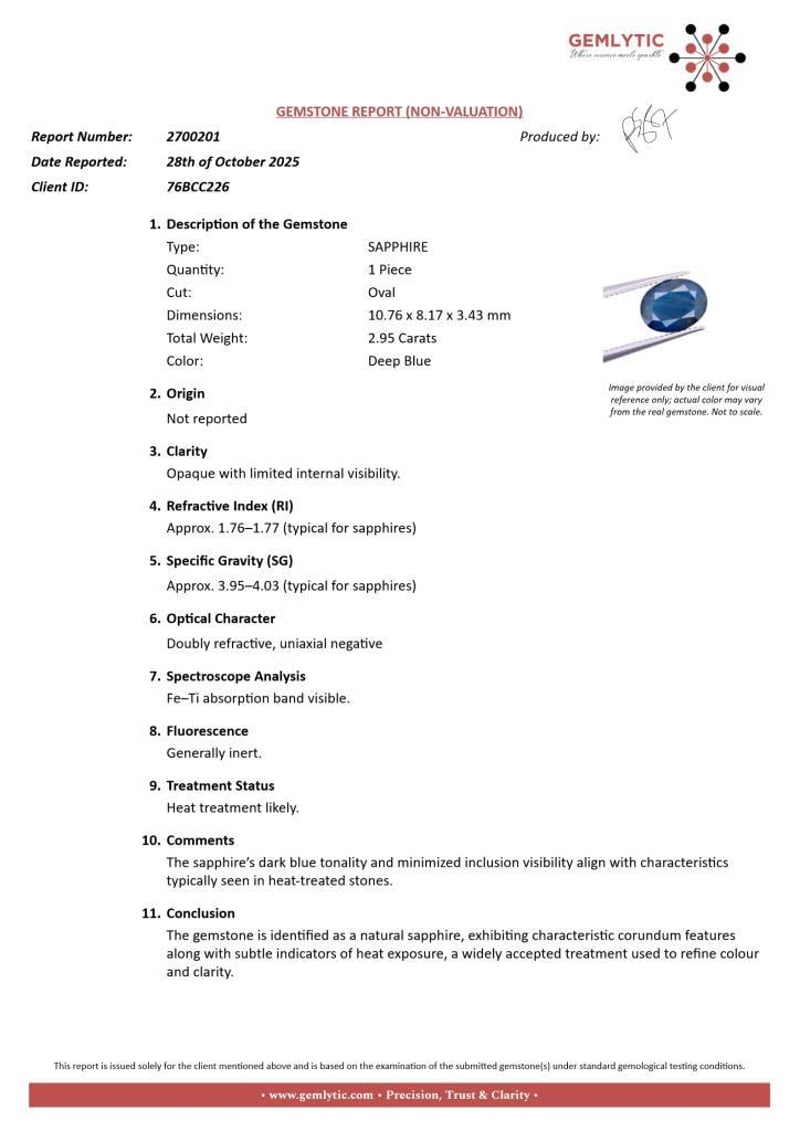 SAPPHIRE - 2.95 CARATS - DEEP BLUE Quantity: 1 PcsReport Number: 2700201Clarity: Opaque With Limited Internal Visibility.Measurements: 10.76 X 8.17 X 3.43Treatments: Heat Treatment Likely.Origin: Not ReportedRefractive Index: Approx. 1.76–1.77 (Typical For Sapphires)Specific Gravity: Approx. 3.95–4.03 (Typical For Sapphires)Spectroscope Analysis: Fe–Ti Absorption Band Visible.Fluorescence: Generally Inert.Comments: The Sapphire’S Dark Blue Tonality And Minimized Inclusion Visibility Align With Characteristics Typically Seen In Heat-Treated Stones.Conclusion: The Gemstone Is Identified As A Natural Sapphire, Exhibiting Characteristic Corundum Features Along With Subtle Indicators Of Heat Exposure, A Widely Accepted Treatment Used To Refine Colour And Clarity. Condition: Good - Refer Images 0488396+17