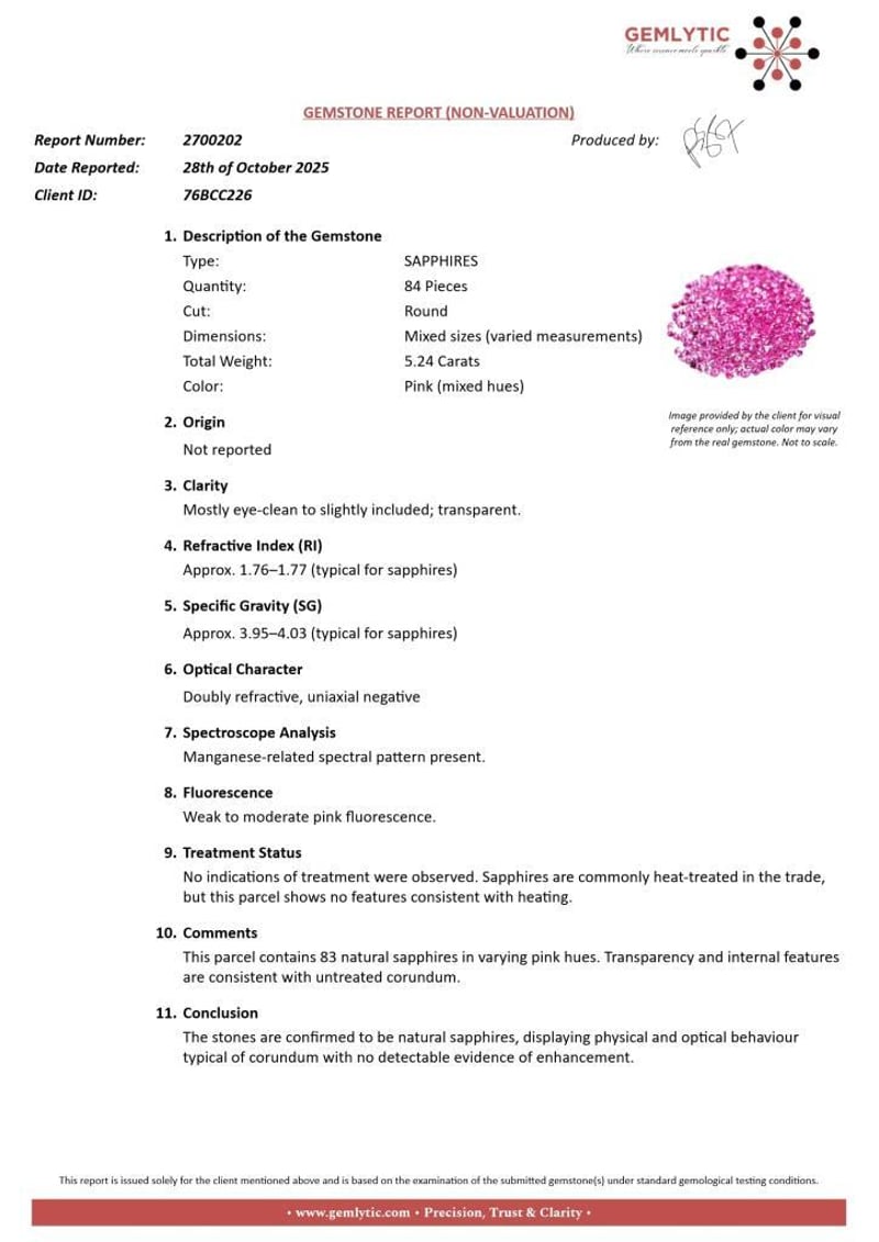 SAPPHIRES - 5.24 CARATS - PINK (MIXED HUES) Quantity: 84 PcsReport Number: 2700202Clarity: Mostly Eye-Clean To Slightly Included; Transparent.Measurements: Mixed SizesTreatments: No Indications Of Treatment Were Observed. Sapphires Are Commonly Heat-Treated In The Trade, But This Parcel Shows No Features Consistent With Heating.Origin: Not ReportedRefractive Index: Approx. 1.76–1.77 (Typical For Sapphires)Specific Gravity: Approx. 3.95–4.03 (Typical For Sapphires)Spectroscope Analysis: Manganese-Related Spectral Pattern Present.Fluorescence: Weak To Moderate Pink Fluorescence.Comments: This Parcel Contains 83 Natural Sapphires In Varying Pink Hues. Transparency And Internal Features Are Consistent With Untreated Corundum.Conclusion: The Stones Are Confirmed To Be Natural Sapphires, Displaying Physical And Optical Behaviour Typical Of Corundum With No Detectable Evidence Of Enhancement. Condition: Good - Refer Images 0488396+18