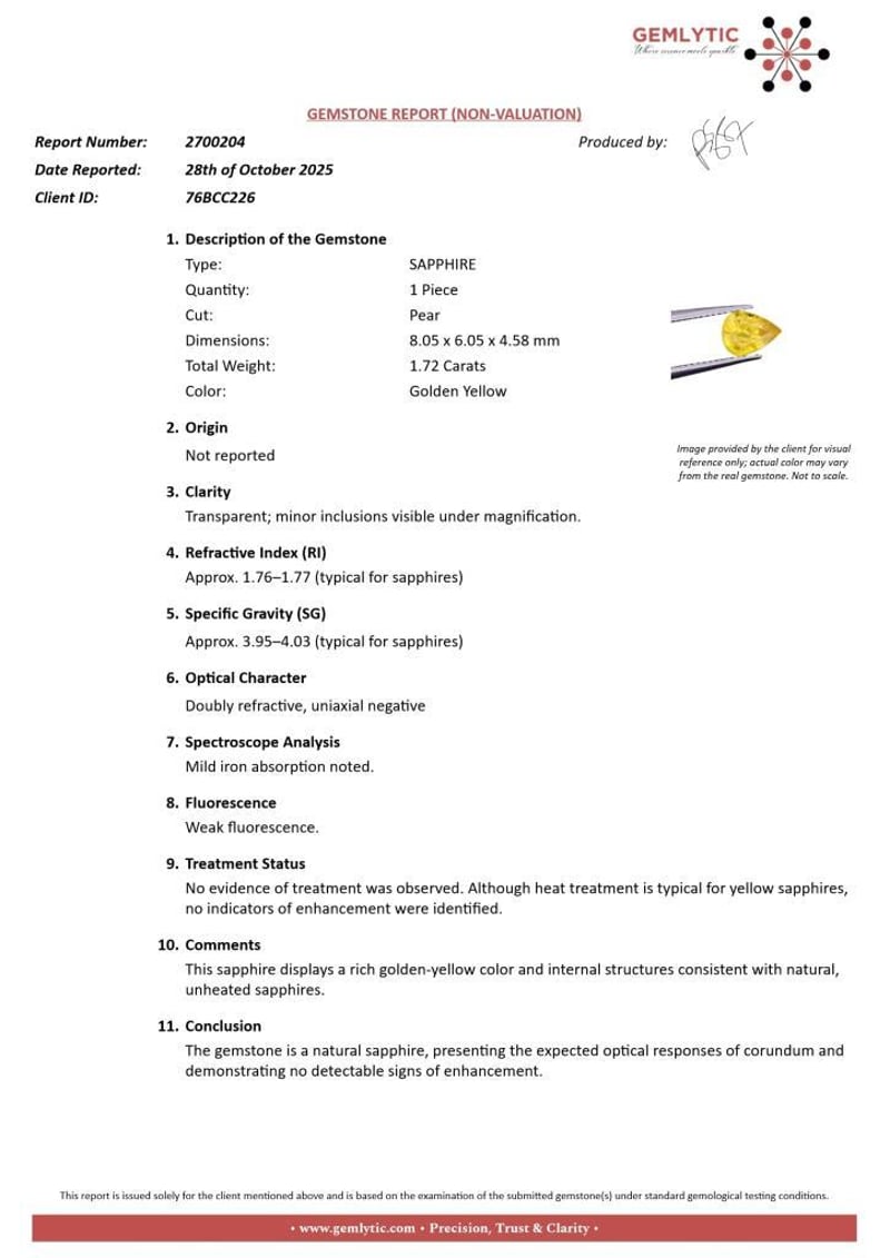 SAPPHIRE - 1.72 CARATS - GOLDEN YELLOW Quantity: 1 PcsReport Number: 2700204Clarity: Transparent; Minor Inclusions Visible Under Magnification.Measurements: 8.05 X 6.05 X 4.58Treatments: No Evidence Of Treatment Was Observed. Although Heat Treatment Is Typical For Yellow Sapphires, No Indicators Of Enhancement Were Identified.Origin: Not ReportedRefractive Index: Approx. 1.76–1.77 (Typical For Sapphires)Specific Gravity: Approx. 3.95–4.03 (Typical For Sapphires)Spectroscope Analysis: Mild Iron Absorption Noted.Fluorescence: Weak Fluorescence.Comments: This Sapphire Displays A Rich Golden-Yellow Color And Internal Structures Consistent With Natural, Unheated Sapphires.Conclusion: The Gemstone Is A Natural Sapphire, Presenting The Expected Optical Responses Of Corundum And Demonstrating No Detectable Signs Of Enhancement. Condition: Good - Refer Images 0488396+20