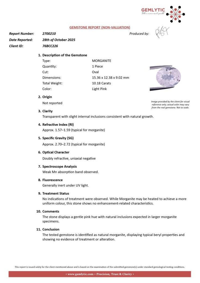 MORGANITE - 10.18 CARATS - LIGHT PINK Quantity: 1 PcsReport Number: 2700210Clarity: Transparent With Slight Internal Inclusions Consistent With Natural Growth.Measurements: 15.36 X 12.38 X 9.02Treatments: No Indications Of Treatment Were Observed. While Morganite May Be Heated To Achieve A More Uniform Colour, This Stone Shows No Enhancement-Related Characteristics.Origin: Not ReportedRefractive Index: Approx. 1.57–1.59 (Typical For Morganite)Specific Gravity: Approx. 2.70–2.72 (Typical For Morganite)Spectroscope Analysis: Weak Mn Absorption Band Observed.Fluorescence: Generally Inert Under Uv Light.Comments: The Stone Displays A Gentle Pink Hue With Natural Inclusions Expected In Larger Morganite Specimens.Conclusion: The Tested Gemstone Is Identified As Natural Morganite, Displaying Typical Beryl Properties And Showing No Evidence Of Treatment Or Alteration. Condition: Good - Refer Images 0488396+26
