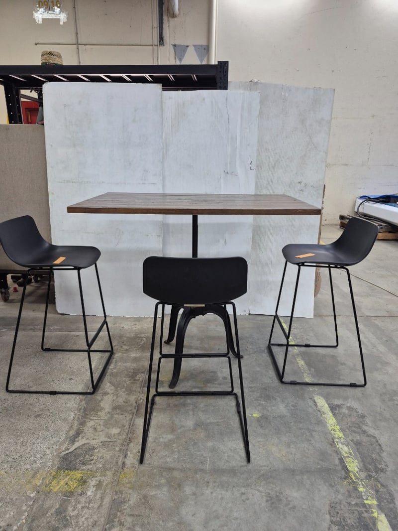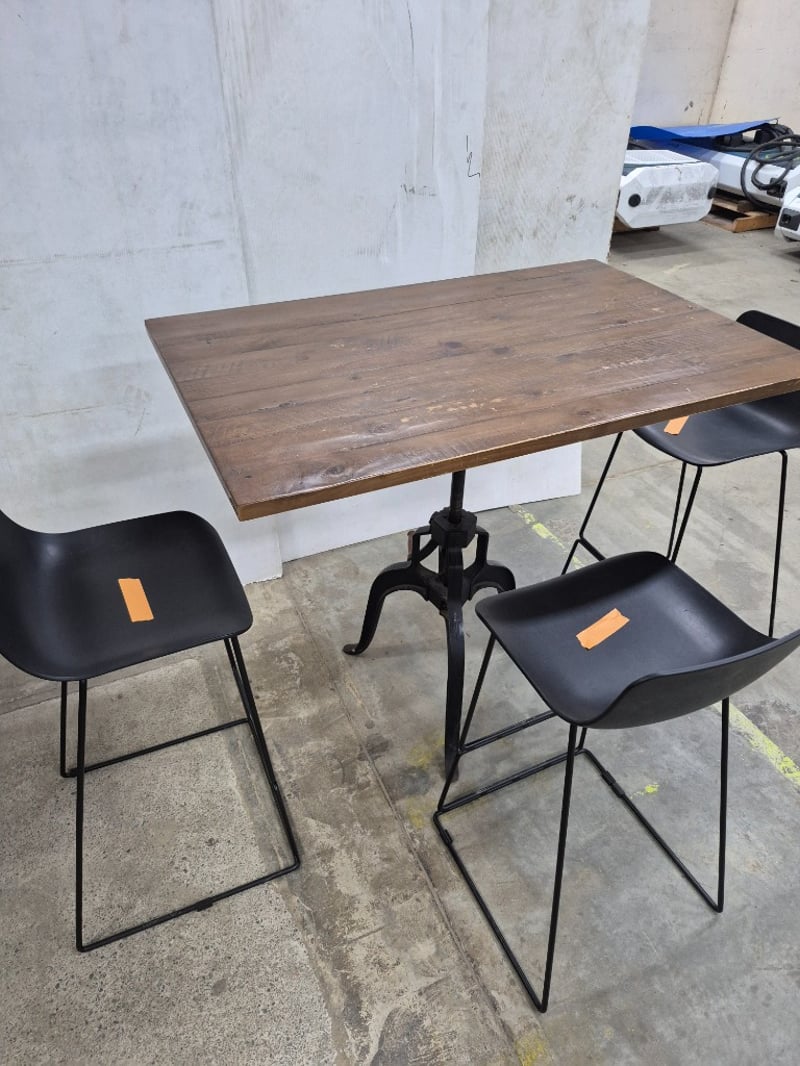 Height adjustable dry top bar table and 3 bar stoolsDimensions table: height 105cm, width 100cm, length 80cmDimensions chair: height 95cm, width 45cm, length 45cmSOLD AS LOT