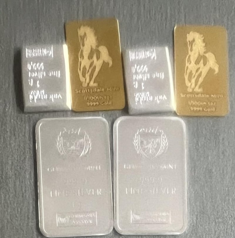 1/100 SCOTTDALE GOLD BAR X 2, 1 GRAM VALCUMBI SILVER BAR X 2 & 1 GRAM GERMANIA MINT SILVER BAR X 2 23528+14