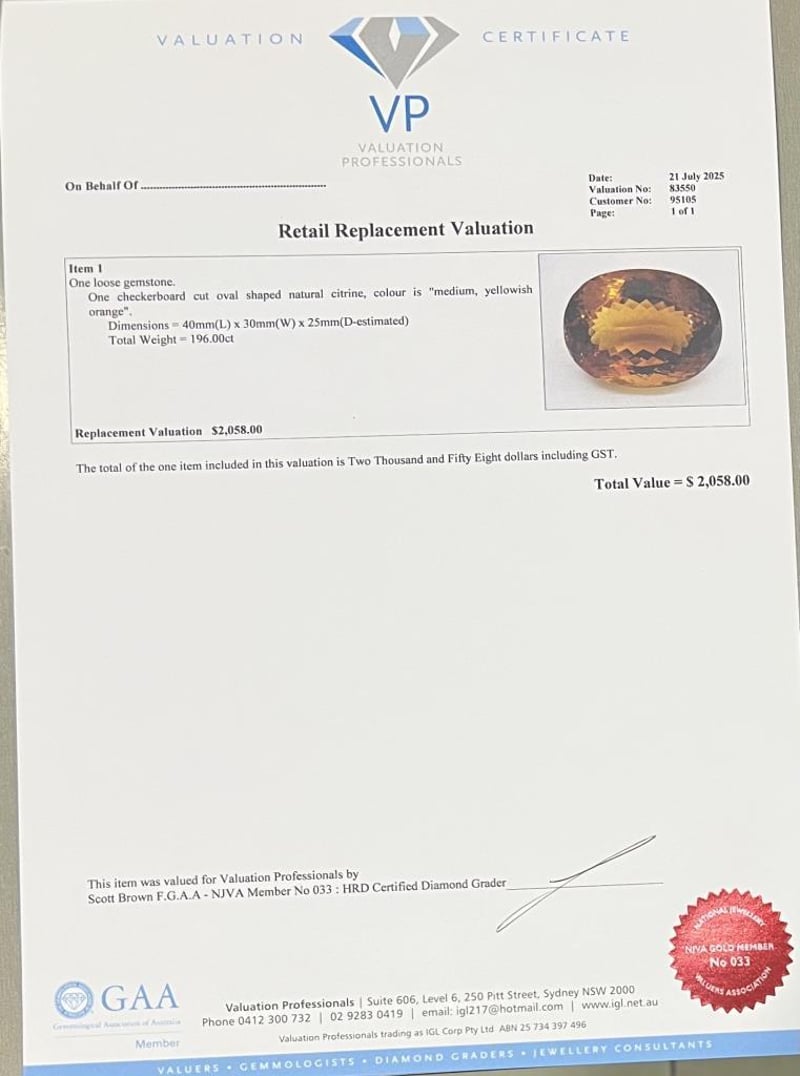 196 CARAT NATURAL CITRINE YELLOWISH ORANGE VALAUTION $2,058