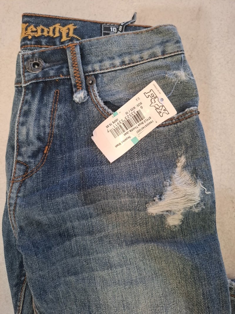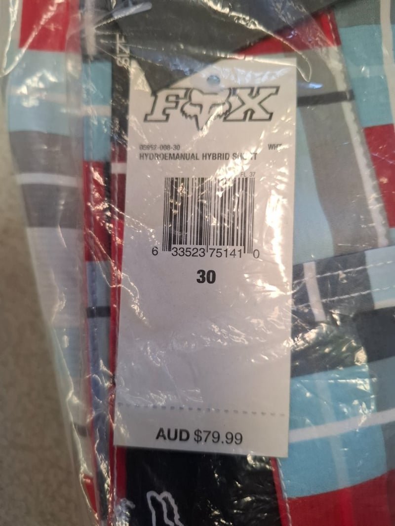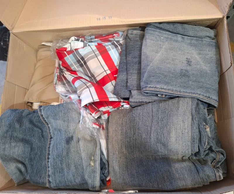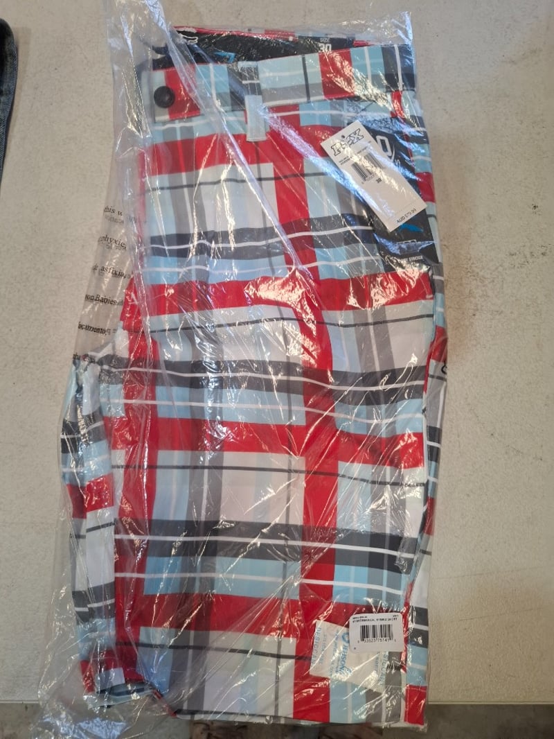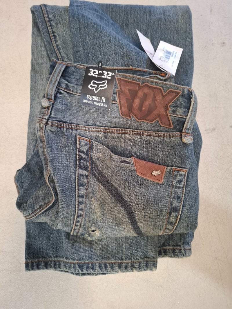 Assorted box of Fox apparal, includng Mens Chinos, shorts and jean, Boys jeans and more. Various sizes and styles.Note: Box may have water damageInspection Recommended