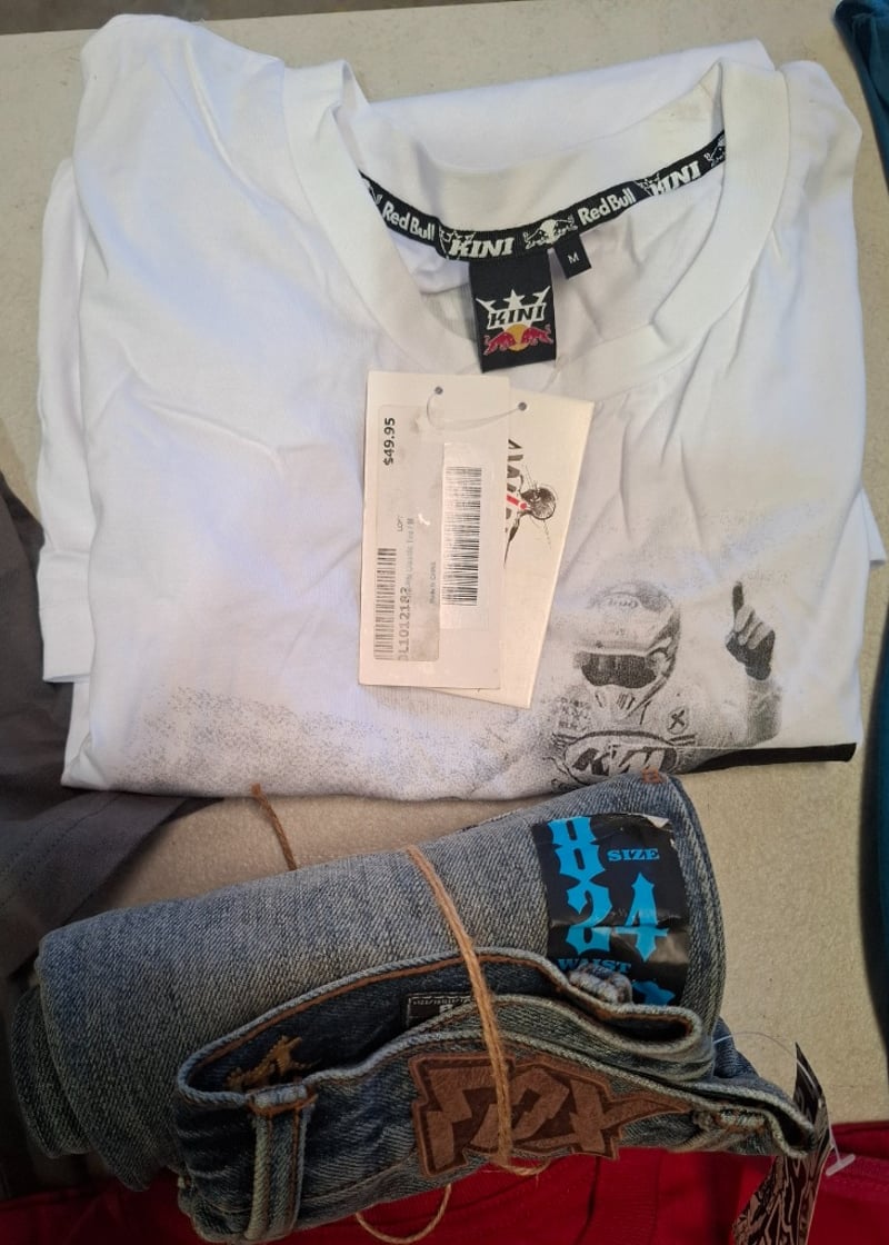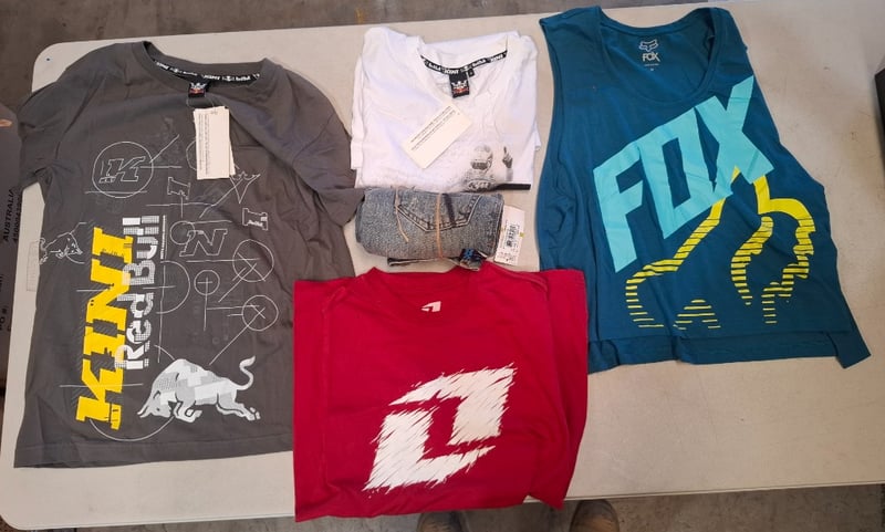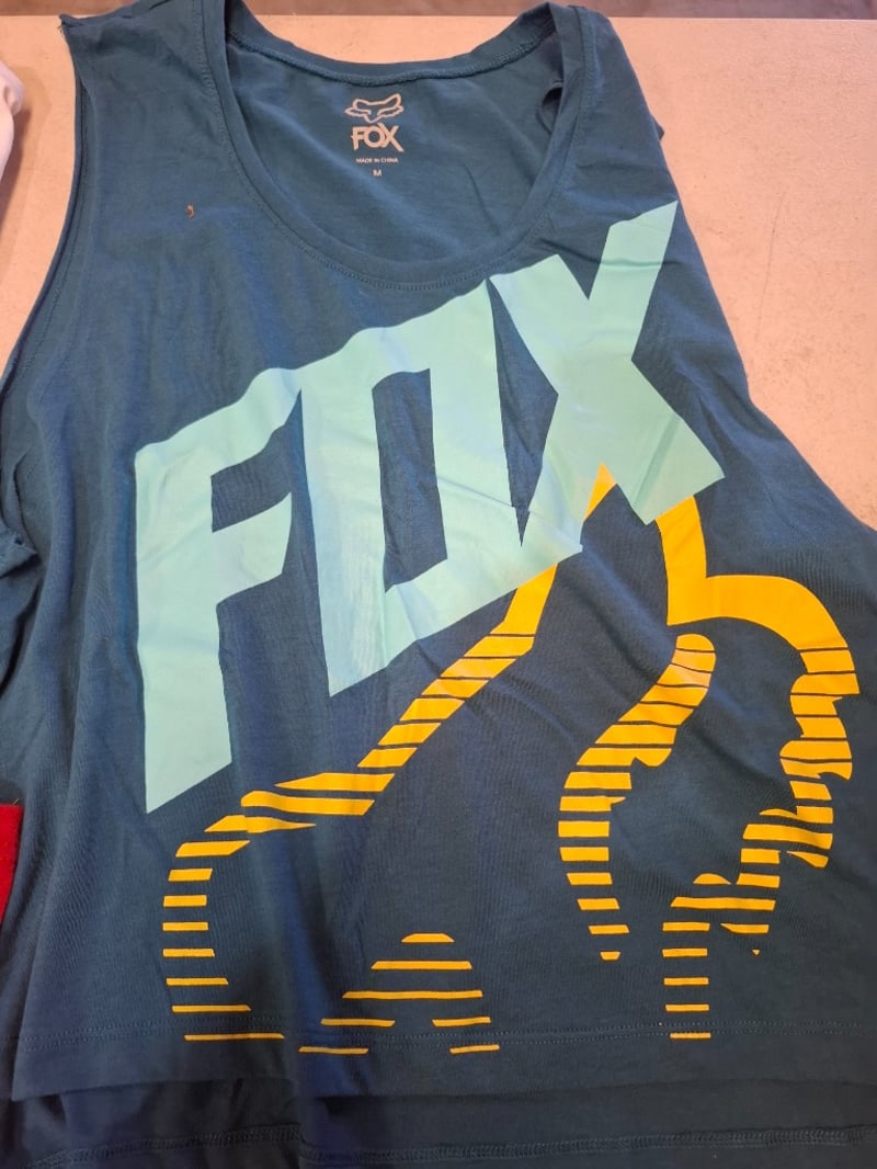 Assorted box of Fox apparal, includng Mens and Boys including Tees, tanks,and and more. Various sizes and styles. Note: Box may have water damage Inspection Recommended Sold as Lot