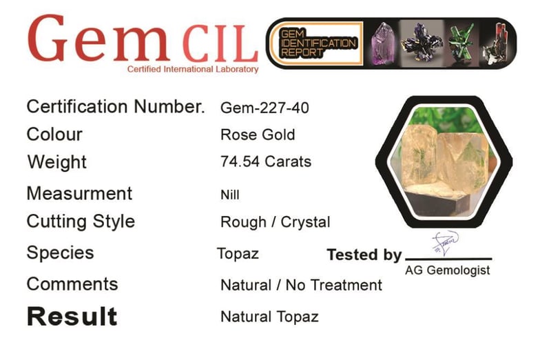 74.54 CARATS NATURALLY TERMINATED IMPERIAL ROSE GOLD TOPAZ SPECIMEN 74.54 Carats Naturally Terminated Imperial Rose Gold Topaz SpecimenStone = Natural TopazWeight = 74.54 Carats Colour = Rose Gold Cut = Naturally TerminatedLustre = Excellent Note = {Natural Termination Is Collectable}, Gem Cil, Certified 0+40