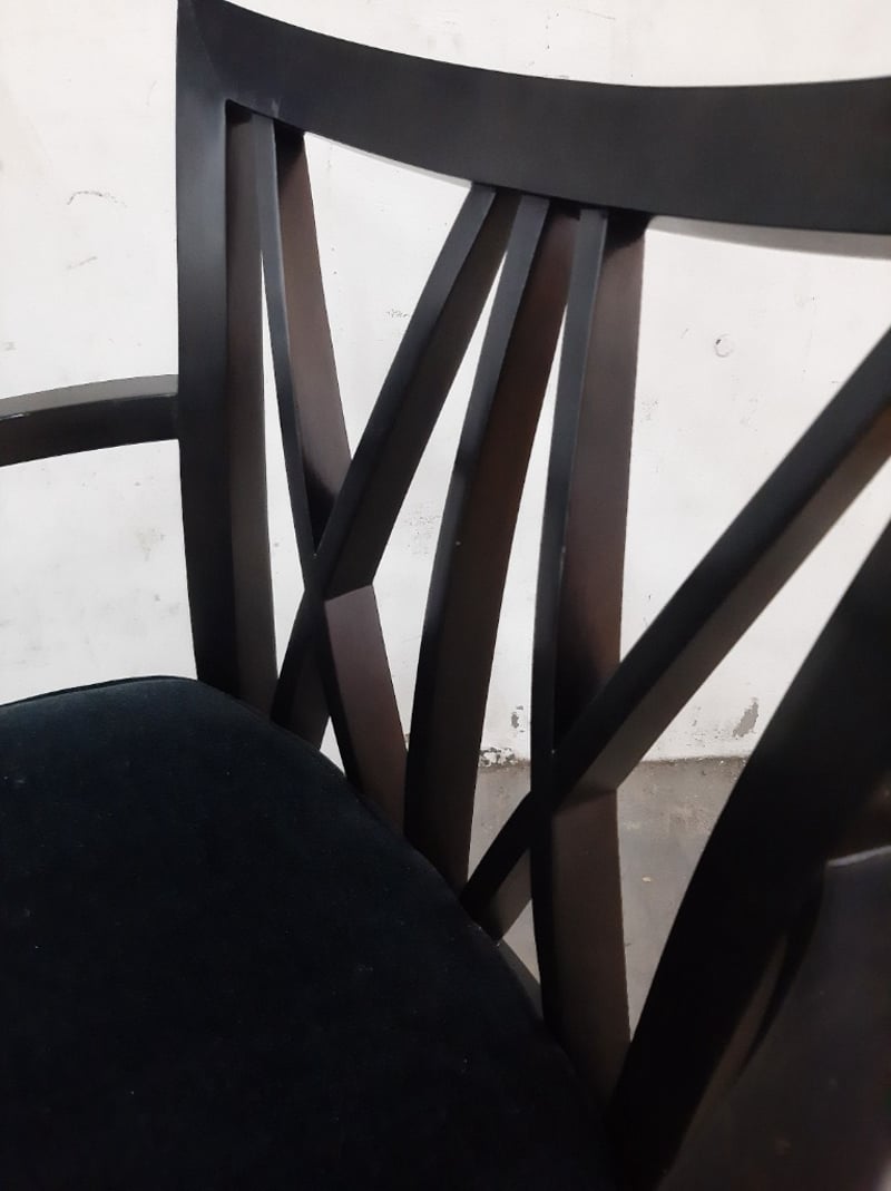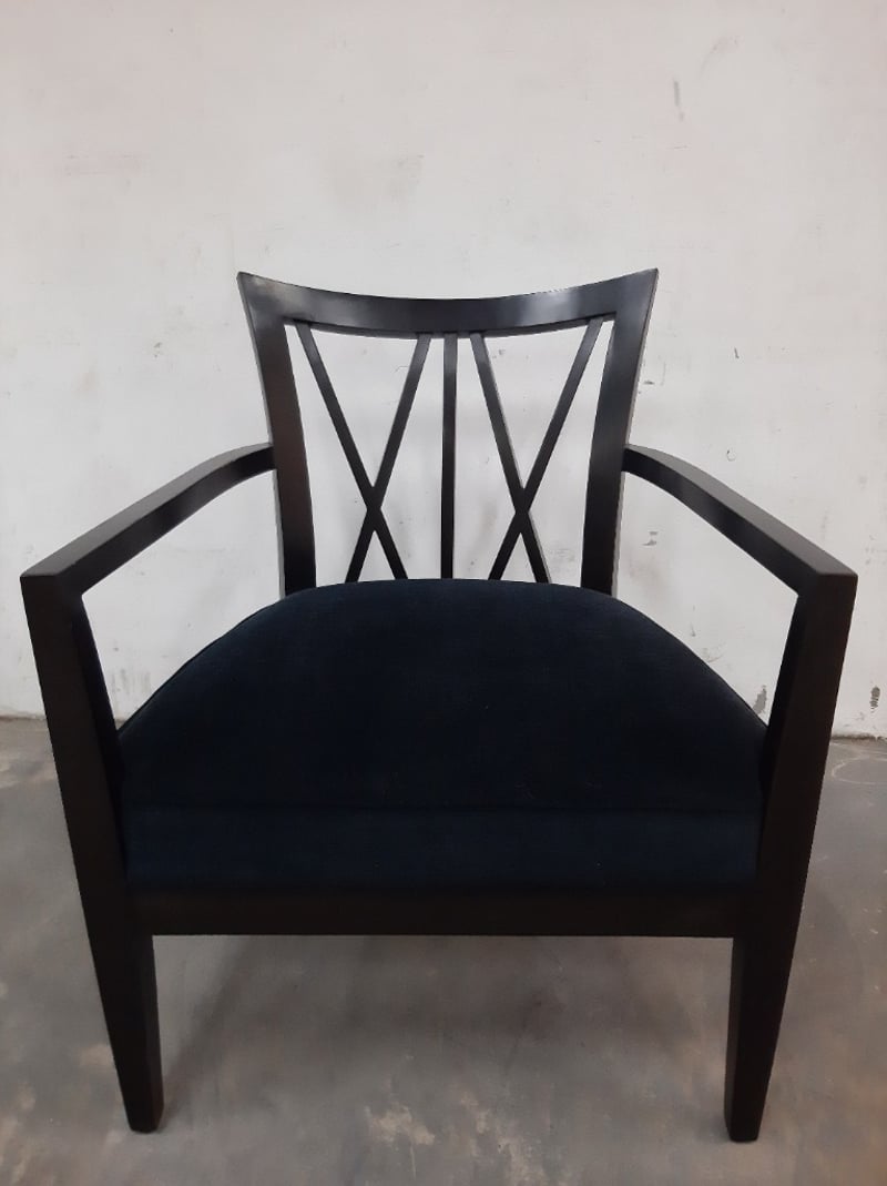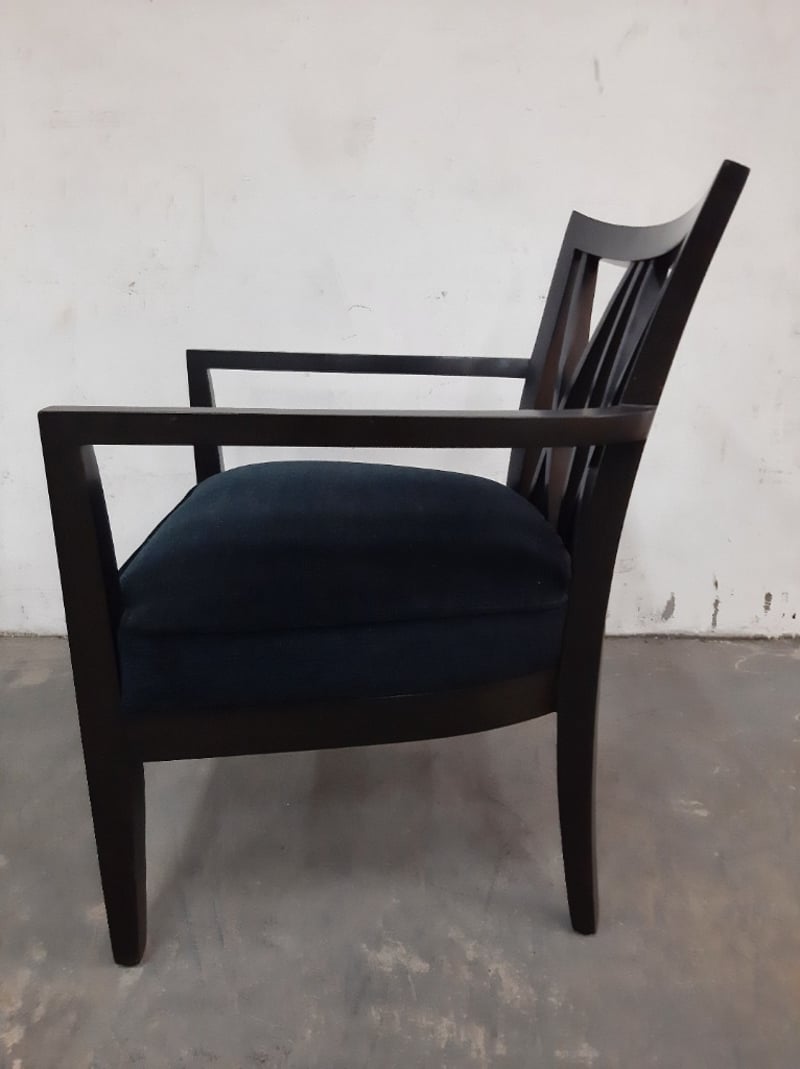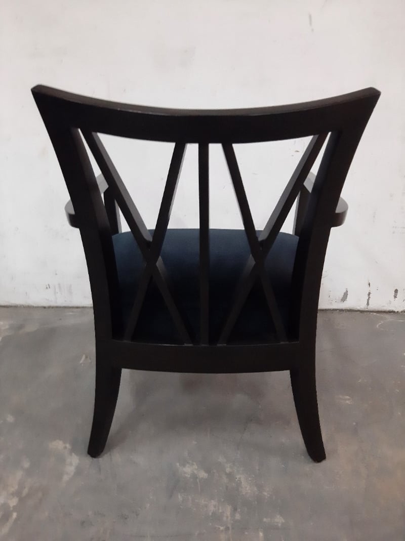 Dining chair, dark brown finish timber frame with navy blue finish cushioned seating Dimensions: 65cm x 80cm x 64cm BID PER EACH, MUST TAKE 2