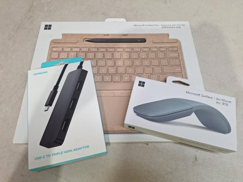1 x MICROSOFT Surface Pro Keyboard with slim pen, Model:1864,1962, NEW factory sealed in box, 1 x MICROSOFT Surface arc mouse, NEW factory sealed in box, 1 x J.BURROWS USB-C triple HDMI adaptor, NEW factory sealed in box