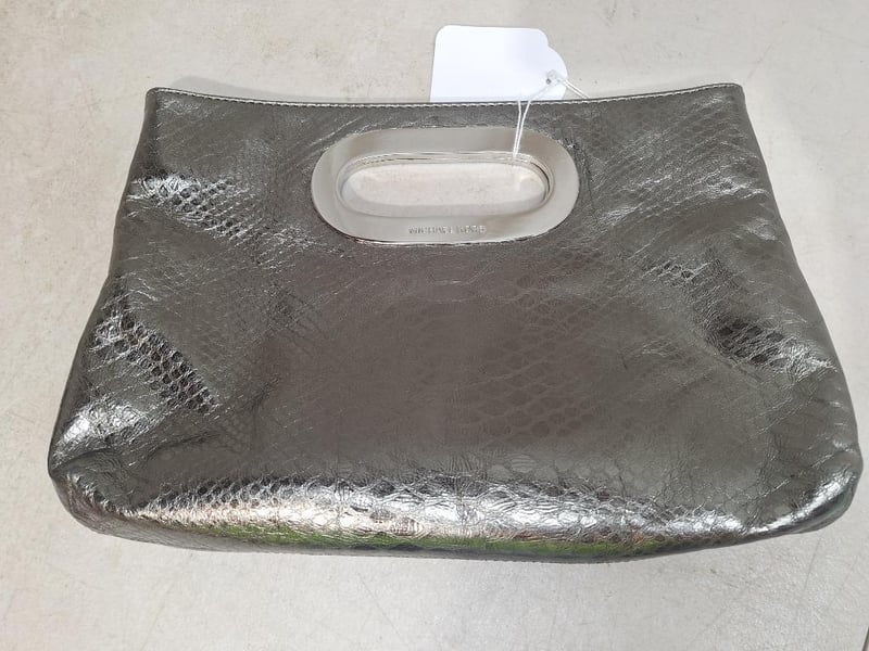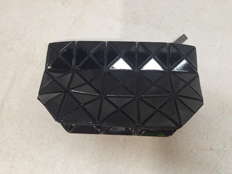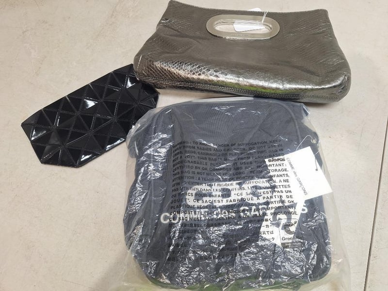 1 x MICHAEL KORS Silver metallic embossed leather clutch bag, silvertone hardware, signature lining , snap lock closure, 1 x ISSEY MIYAKE BaoBao black cosmetic pouch, 1 x CDG crossbody black nylon bag, NEW with tags,