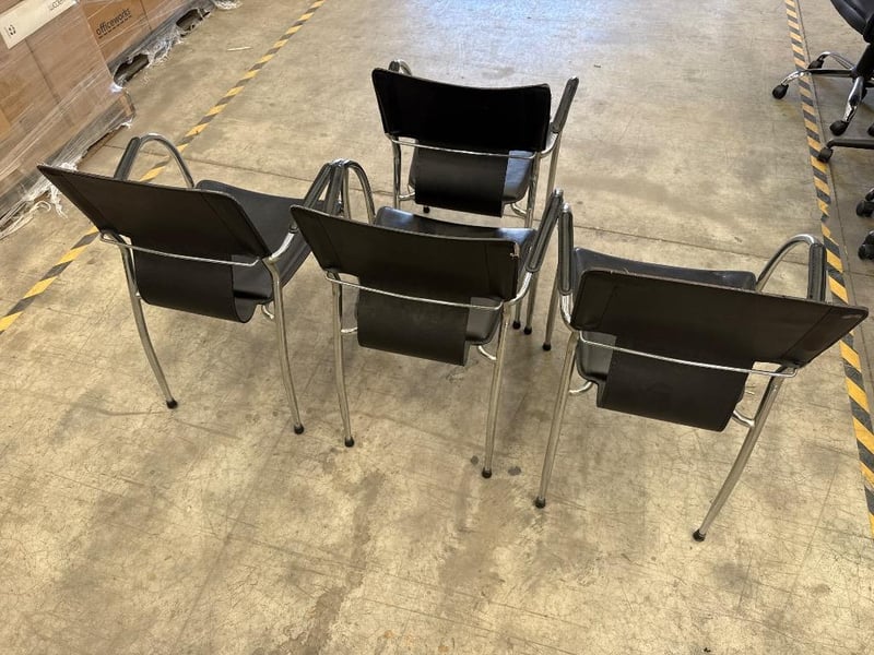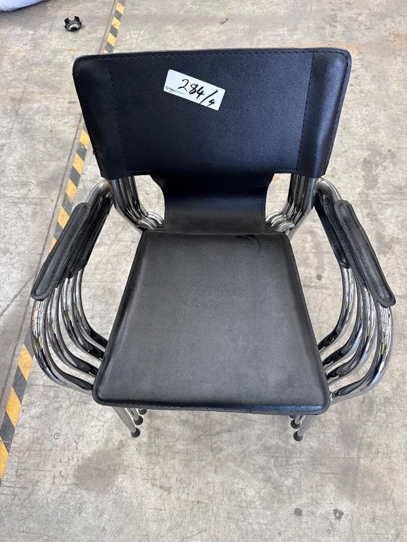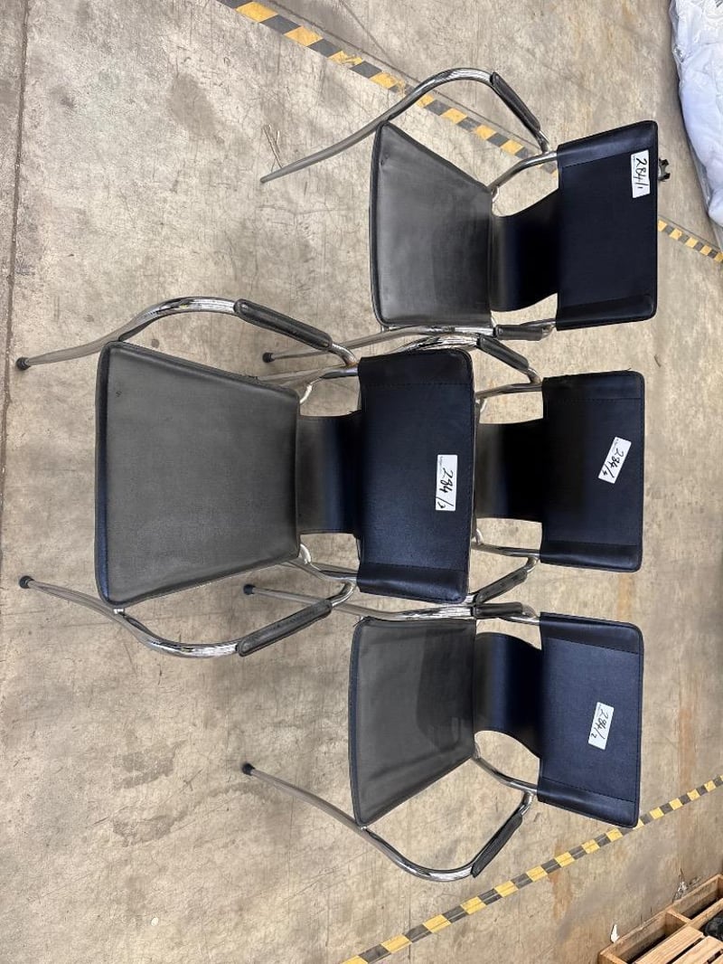RRP: $280, Reception Chairs, Reception Chairs Upholstered with black leather and a Steel frame with 4 legs Quantity: 4 Some damages on Leather upholstery" Sold as lot.