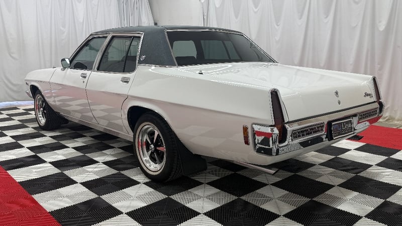 1973 Holden HQ Statesman Deville sedan finished in white. Rear‑wheel drive configuration powered by a 5.0‑litre (308ci) V8 petrol engine paired with an automatic transmission. Odometer indicating 19,264 miles.