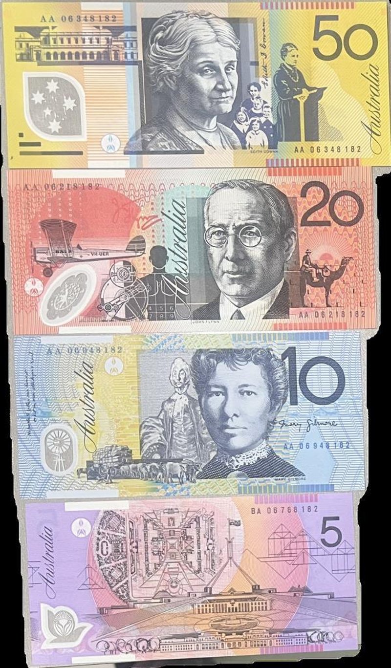 2002- AUSTRALIA- $50/$20/$10/$5 FIRST PREFIX ACCEPT FOR $5 DOLLAR SIGNATURE MACFARLANE HENRY ALL FOUR BANK NOTES HAS ENDING FOUR NUMBER WITH 8182 VERY RARE UNC BANKNOTE COLLECTABLE NOTES IN DEMAND 311157+31