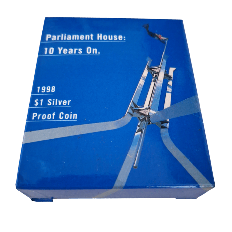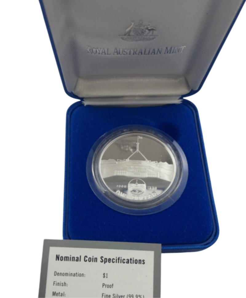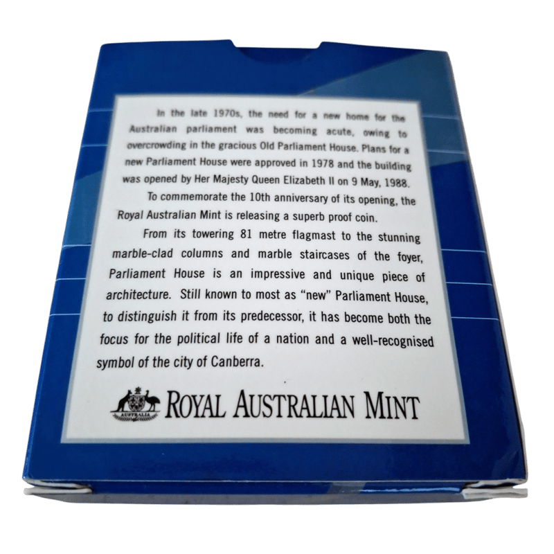 PARLIAMENT HOUSE 10 YEARS ON - 1998 1OZ SILVER PROOF COIN IN BOX Parliament House 10 Years On - 1998 1Oz Silver Proof Coin In Box With Cert Condition: Unc 23528+46