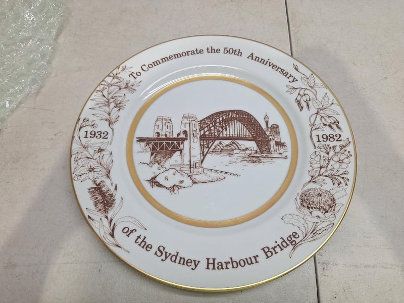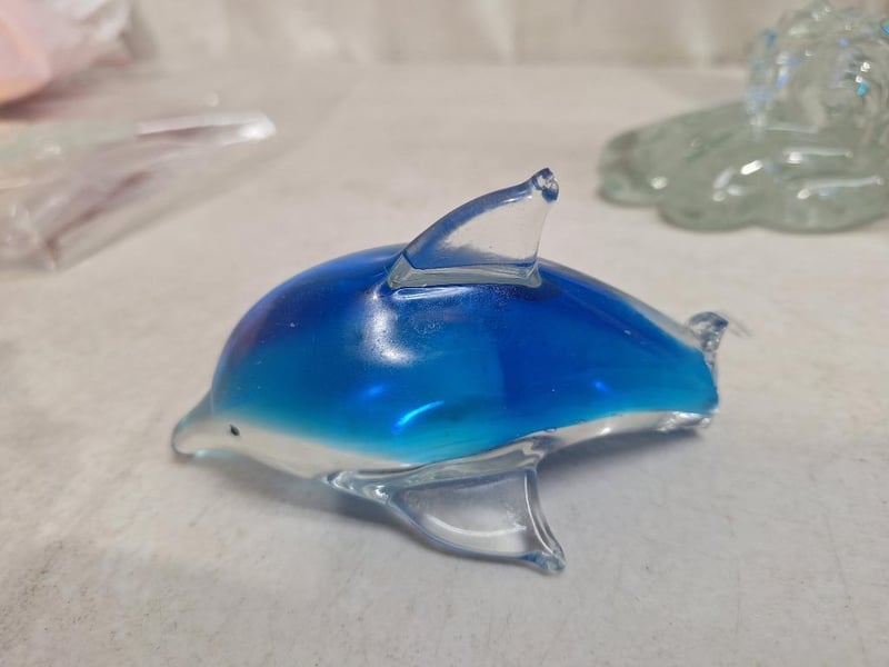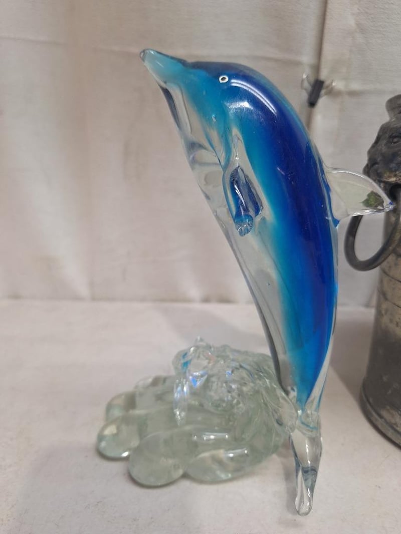 2 x Glass Dolphin Figurines, 1 x 50th Annivesary 1932-1982 Sydney Harbour Bridge Commermorative Plate, fine China, limited edition, 1 x silver tone ice bucket with lion head & O Ring handles,