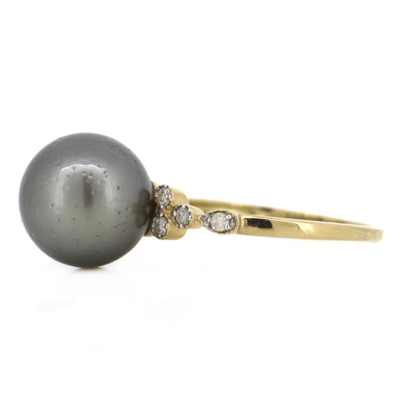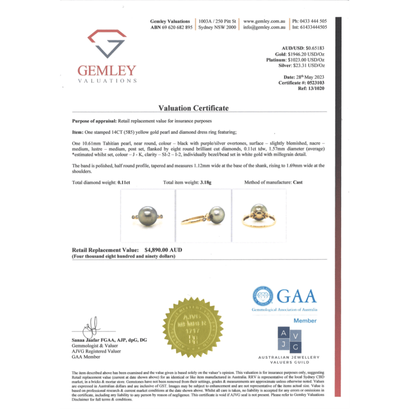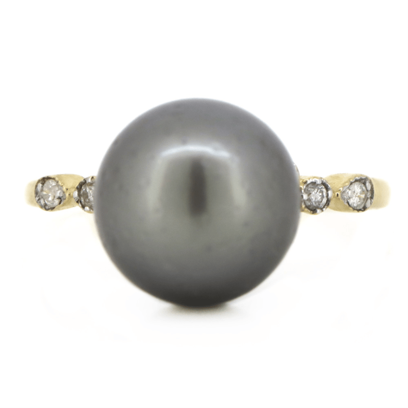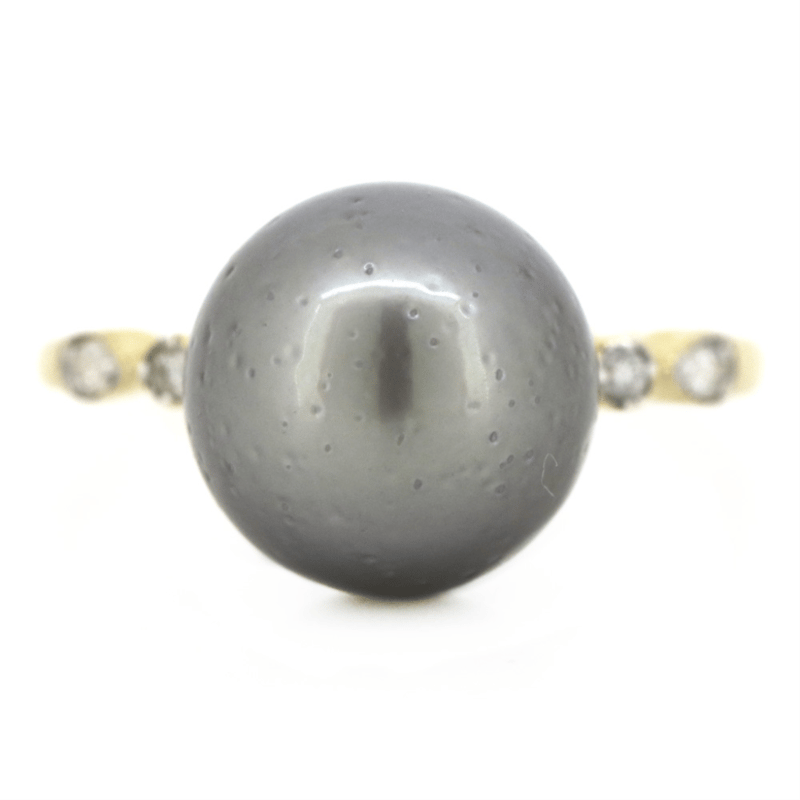 14K YELLOW GOLD, BLACK CULTURED TAHITIAN PEARL AND DIAMOND, DRESS RING. The Design Features, One Round, Black With Purple/Silver Overtones, Cultured Tahitian Pear (10.61Mm, Medium Lustre, Slightly Blemished), Post Set. Flanking The Centre Along The Band Are, 8 Round Brilliant Cut, Diamonds (0.11Ct Tdw, J-K Colour, Si2-I2 Clarity), Bezel/Bead Set In White Gold With Millegrain Detail. Ring Size N 1/2. Valuations Provided by an Independent Third-Party Professional Not Directly Associated With Lloyds Auctions at AUD $$4,890.00This valuation has been conducted by an independent third-party professional. The valuation amount is an assessment by the issuing valuer and does not reflect the auction value of the item. Any inquiries regarding the valuation should be directed to the issuing valuer (refer to contact details on the certificate), as Lloyds Auctions has no affiliation or influence over the valuation, the valuer, or the stated amount. Condition: Good - Refer Images 0+1475